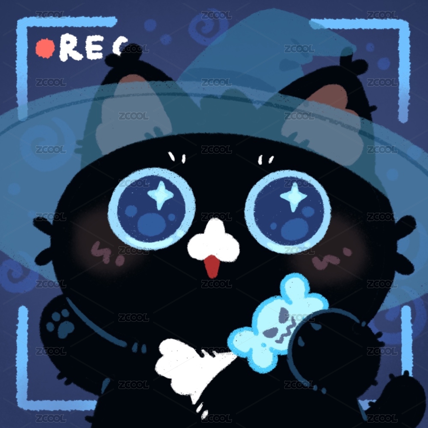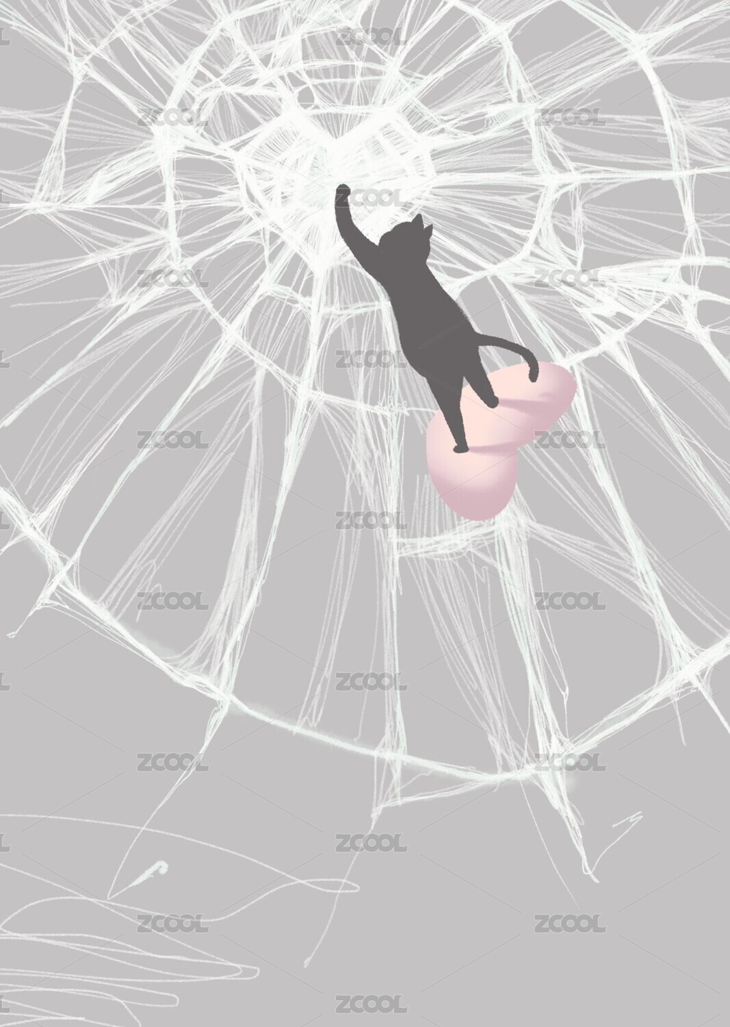 手绘卡通一个可爱的小黑猫半挂在一半被咬掉的苹果上