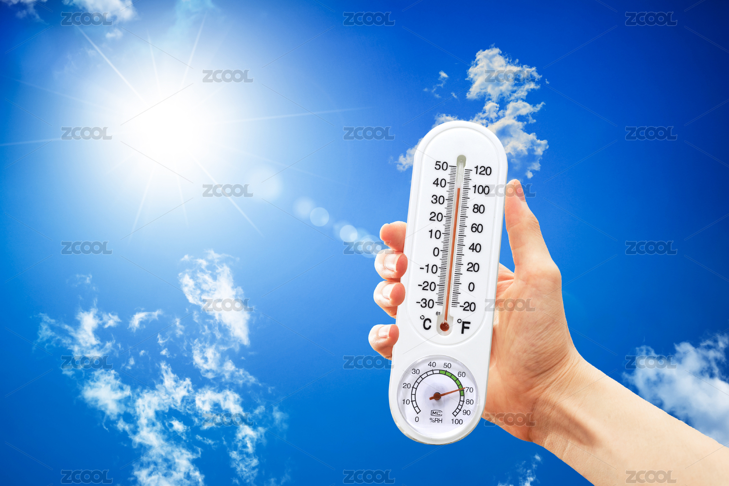 户外高温炎热天气太阳下一只手拿着温度计
