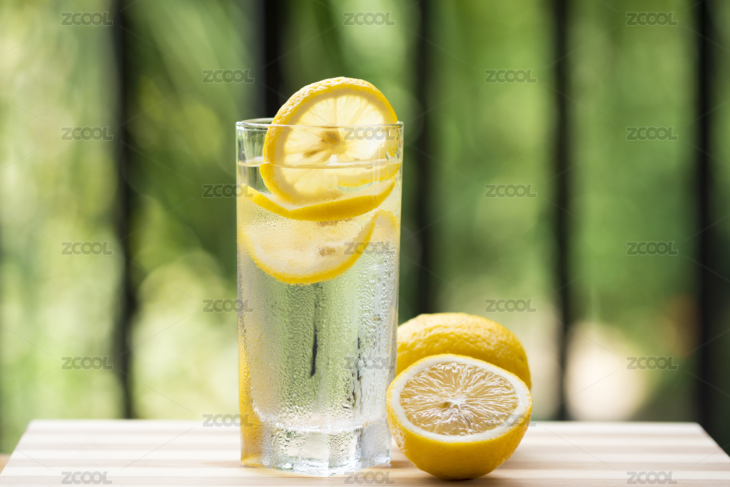 柠檬水和新鲜柠檬在木桌板上