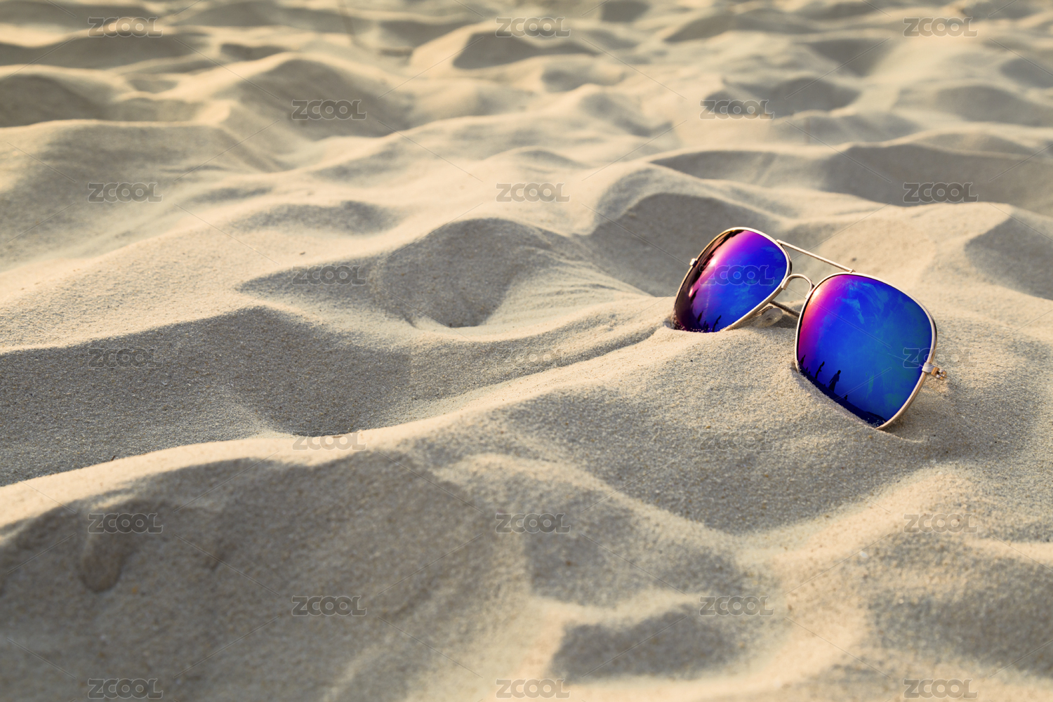 炎热夏天日落时沙滩上的太阳眼镜特写
