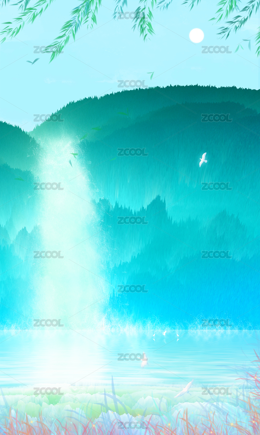 炎热夏天山峰间的瀑布从高处流下汇入到湍急河流中,杨柳随风飘运中国风插画背景海报
