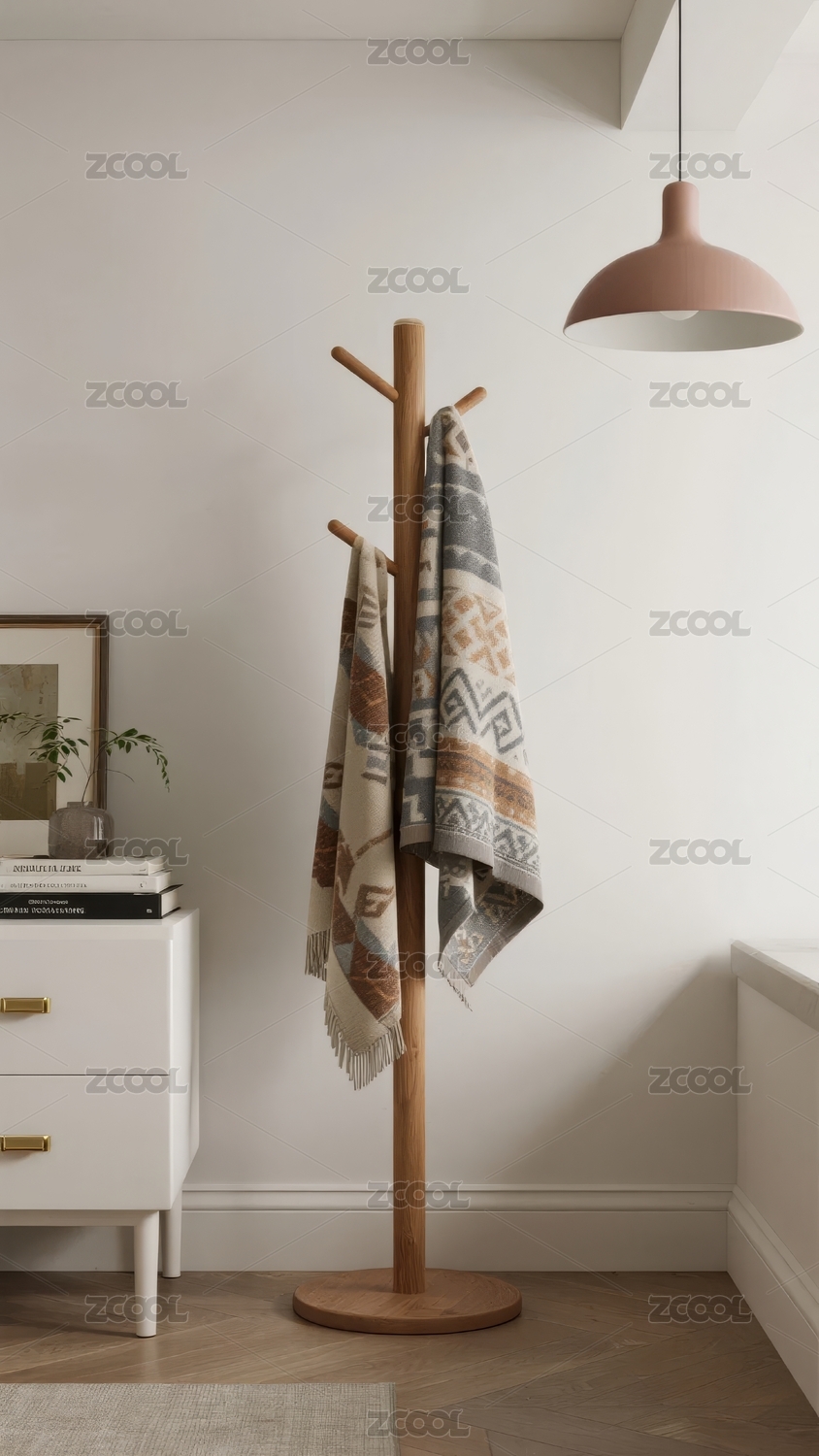 简约风格室内一角挂衣架毛巾与装饰画