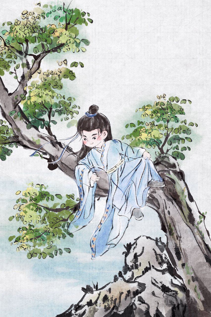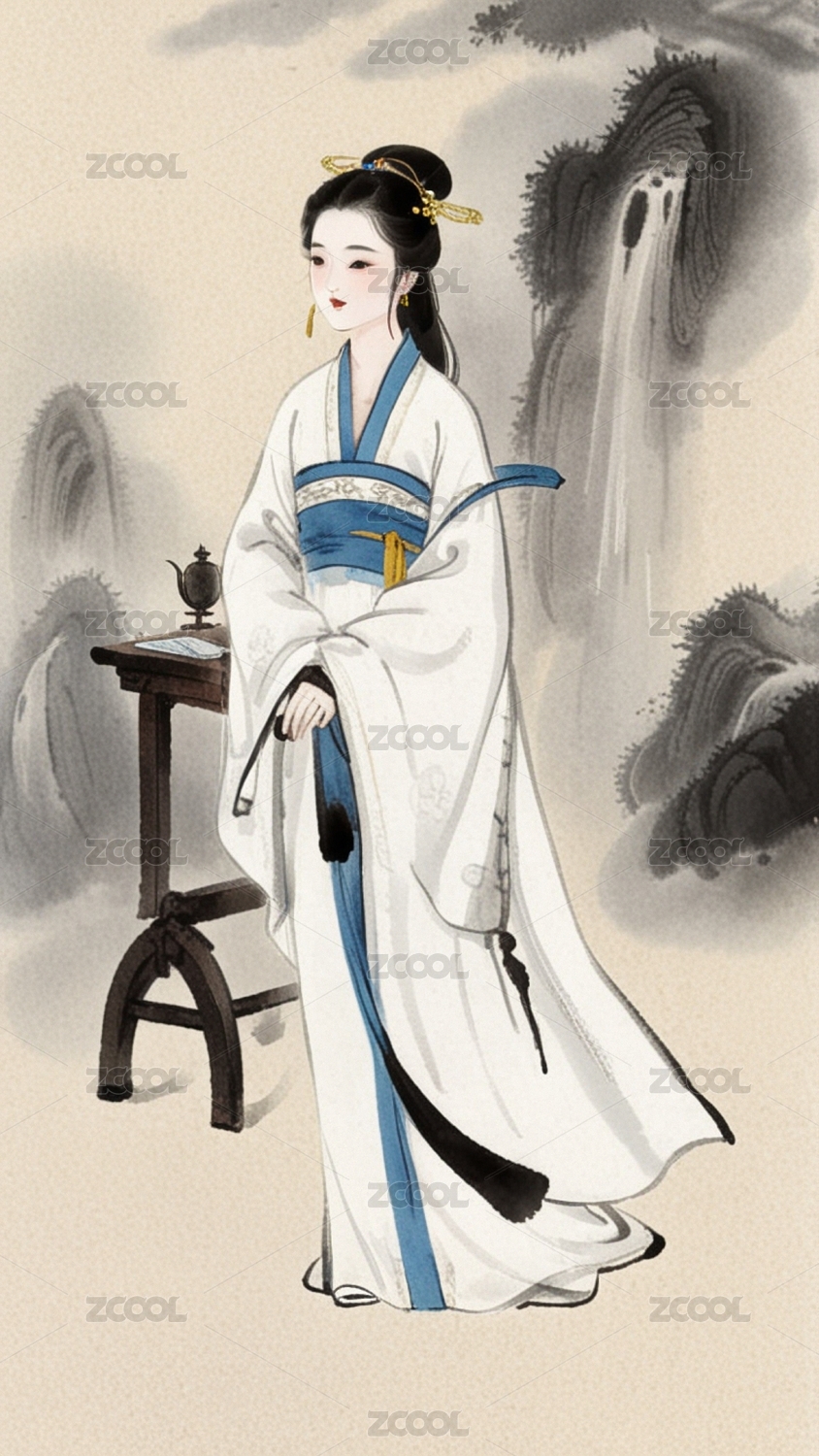 嫩绿古风水墨人物女子站在桌子边书写画画
