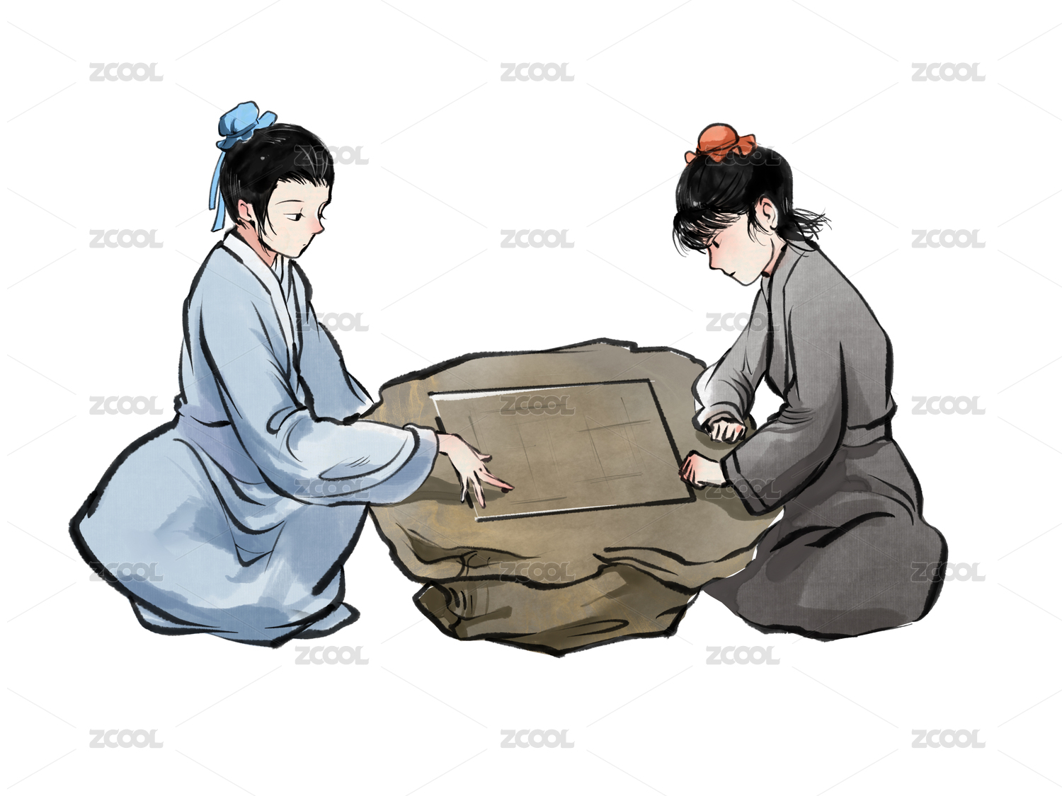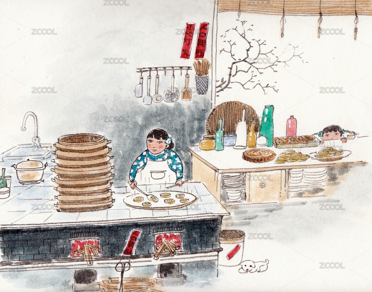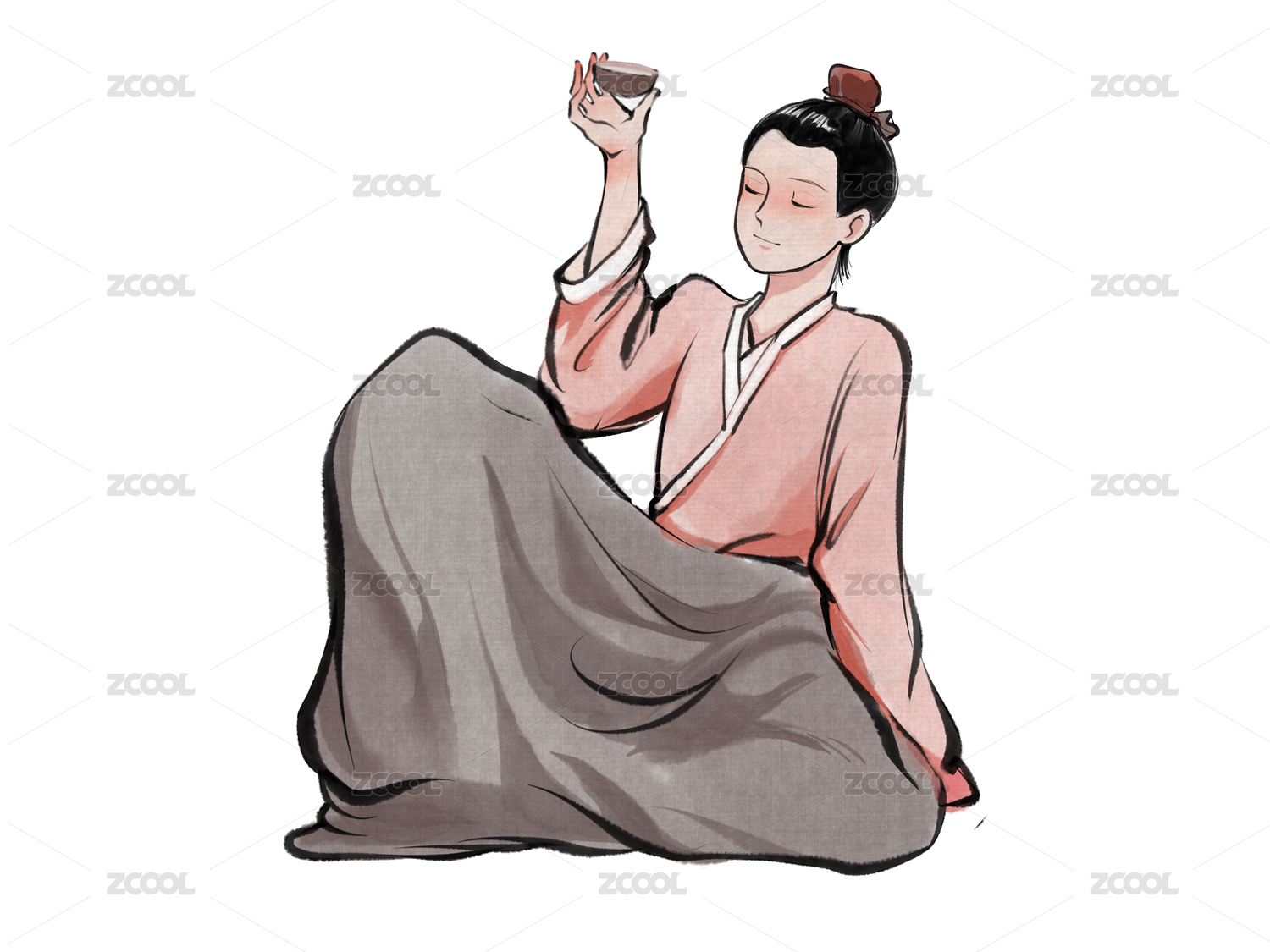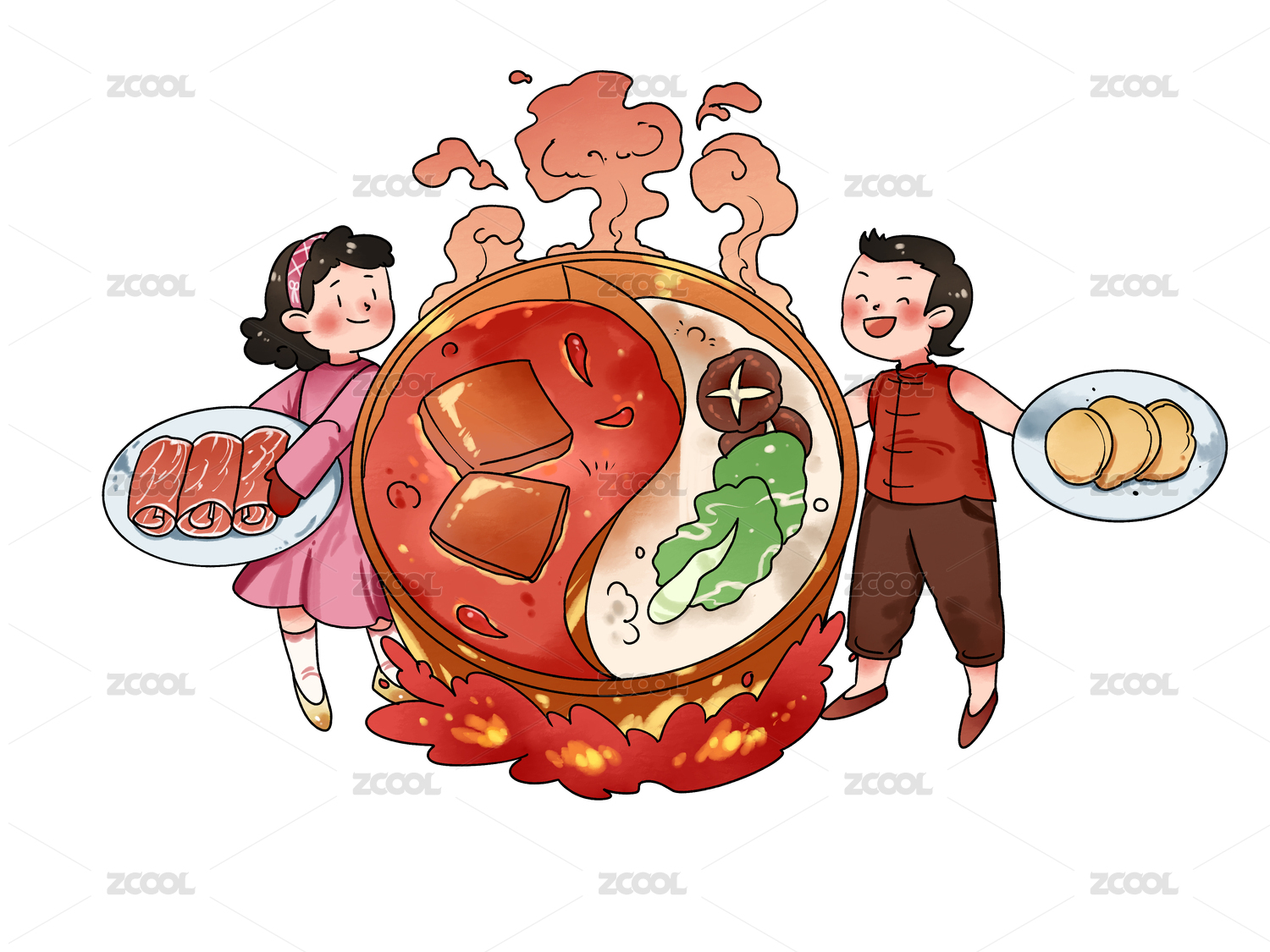水墨人物创意吃美食小吃美食鸳鸯火锅