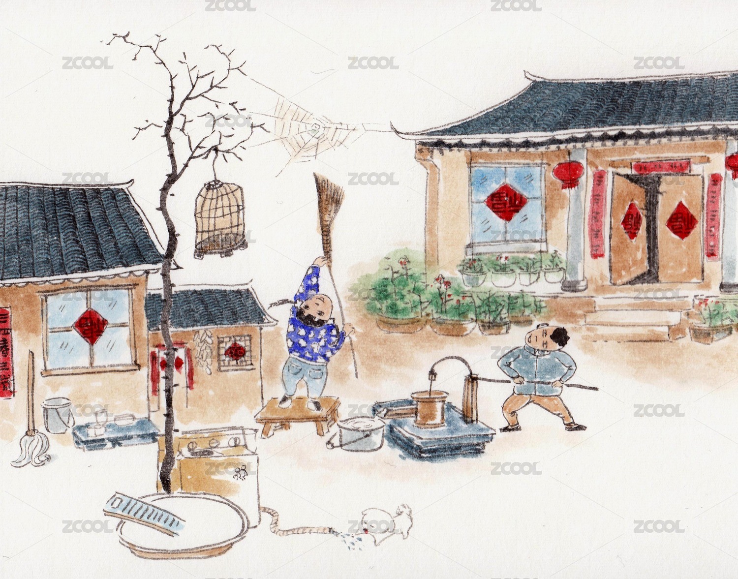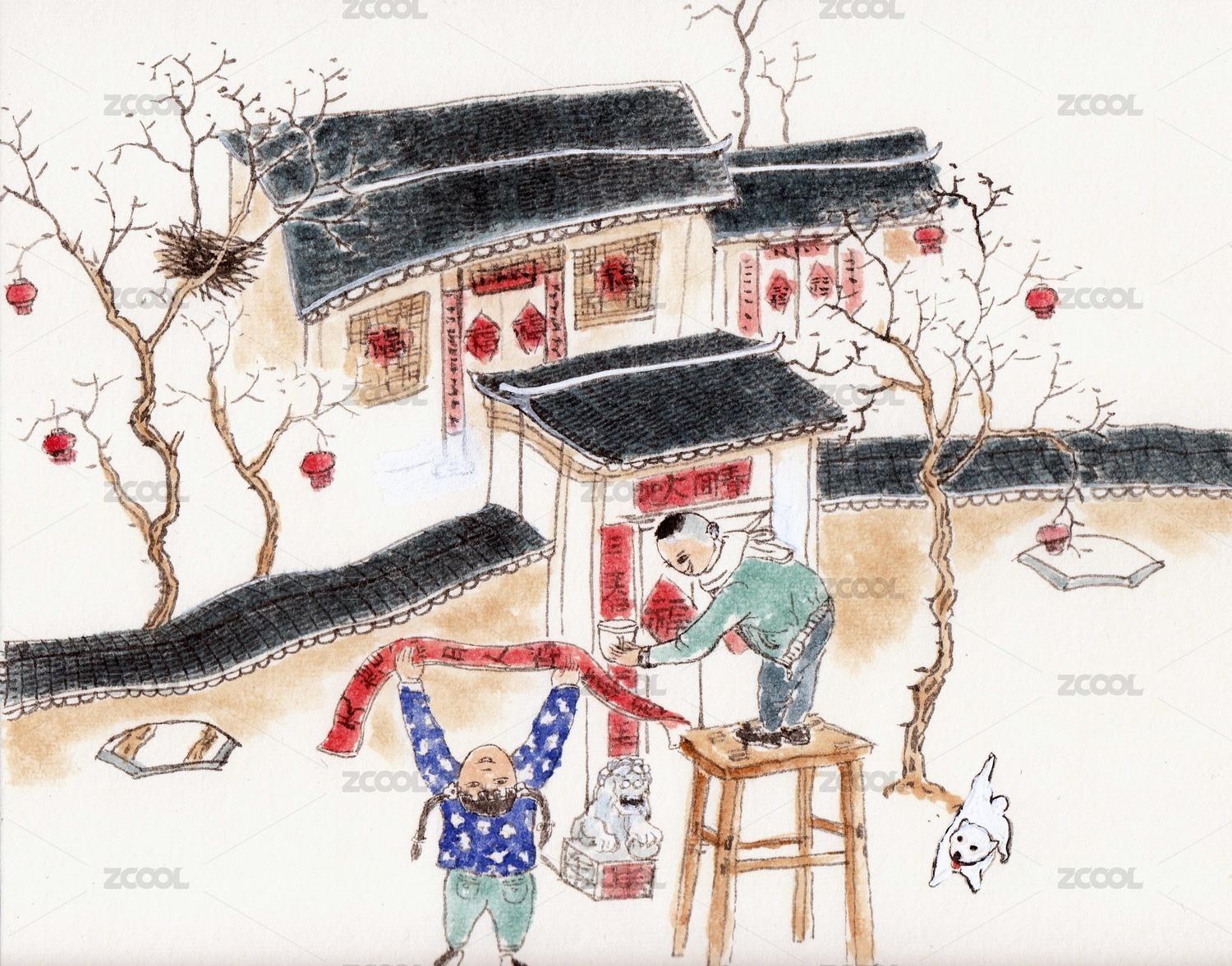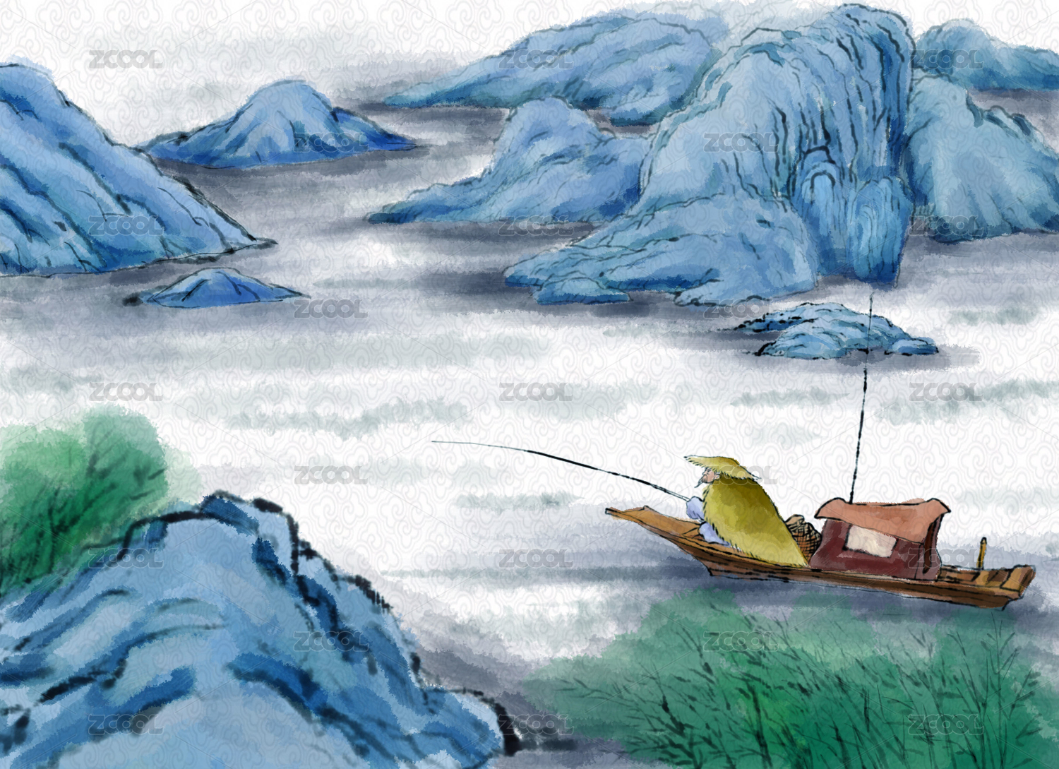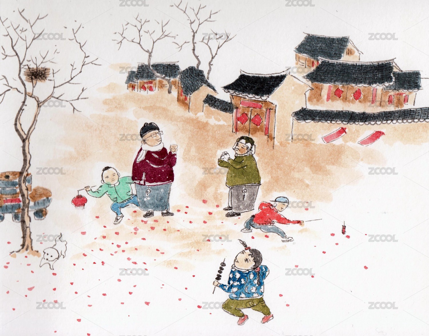 水墨人物创意吃美食小吃美食鸳鸯火锅