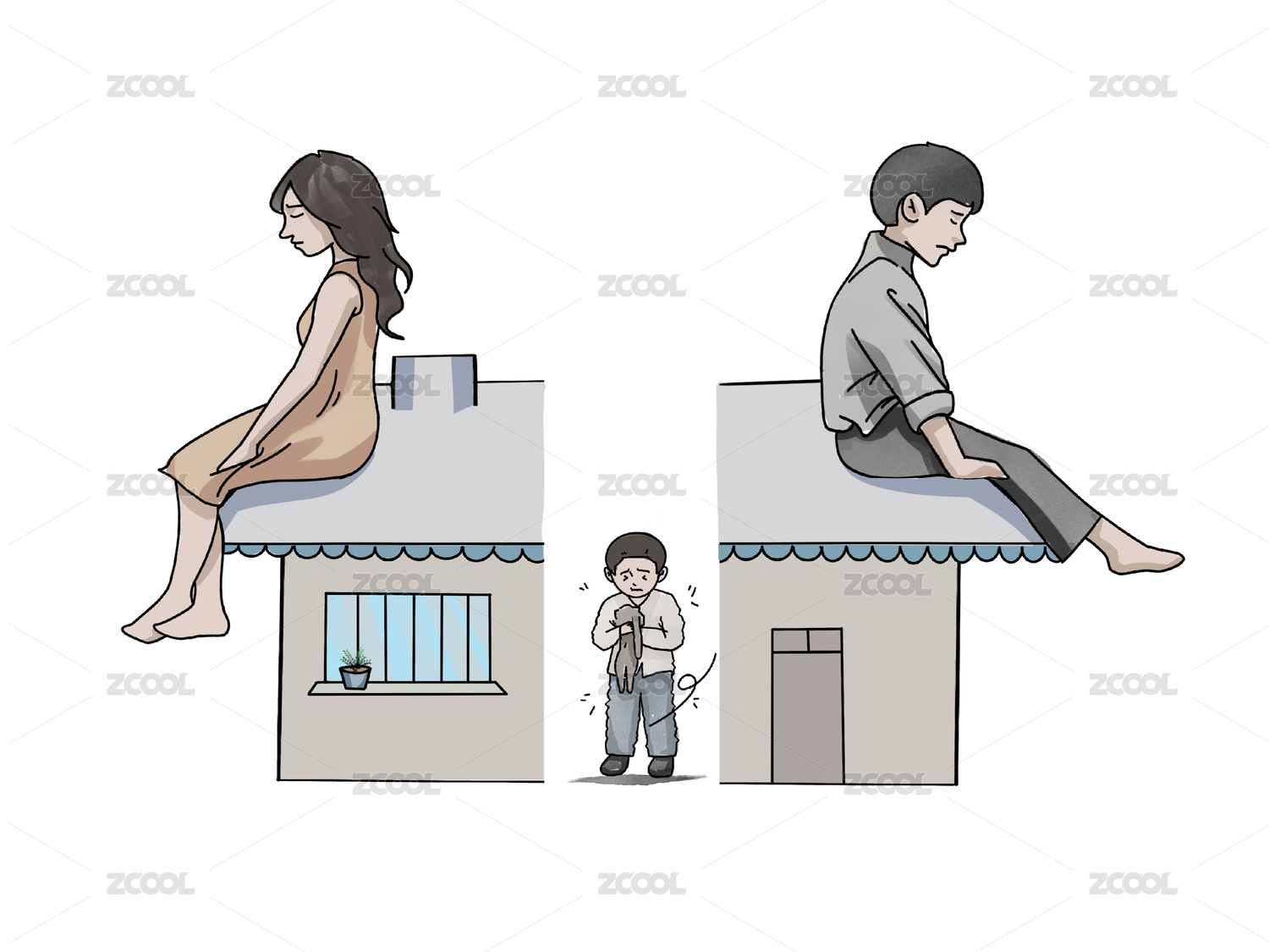 夫妻离婚争夺家产和孩子概念插画