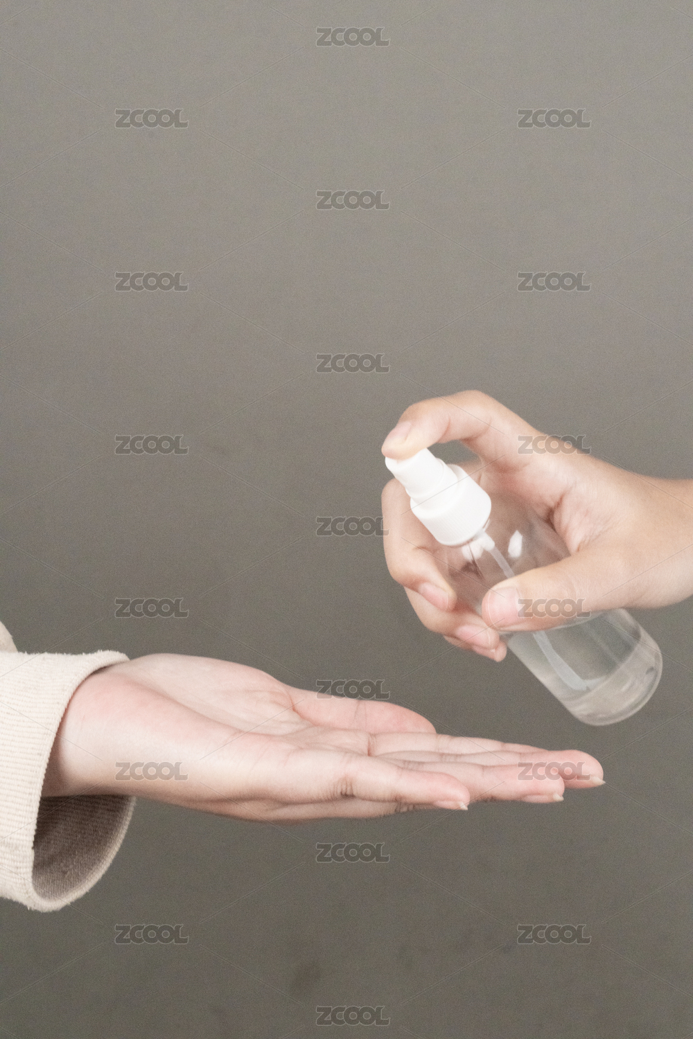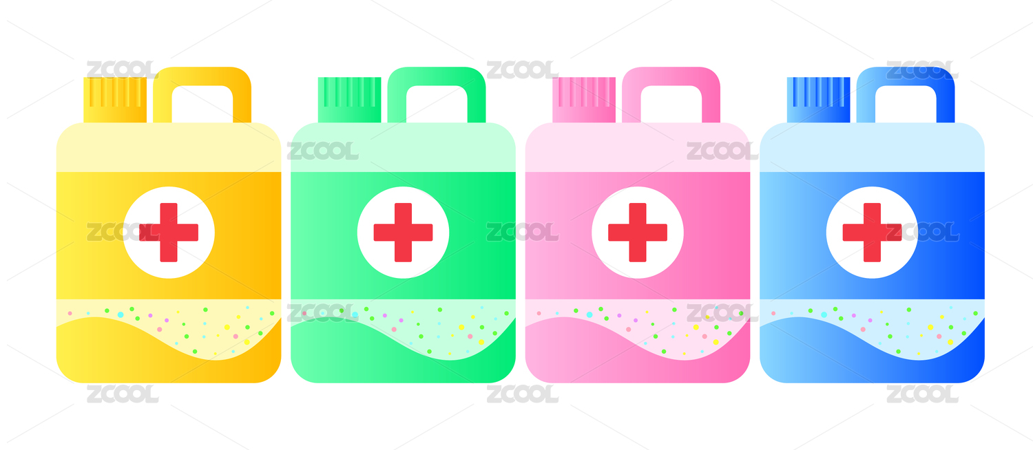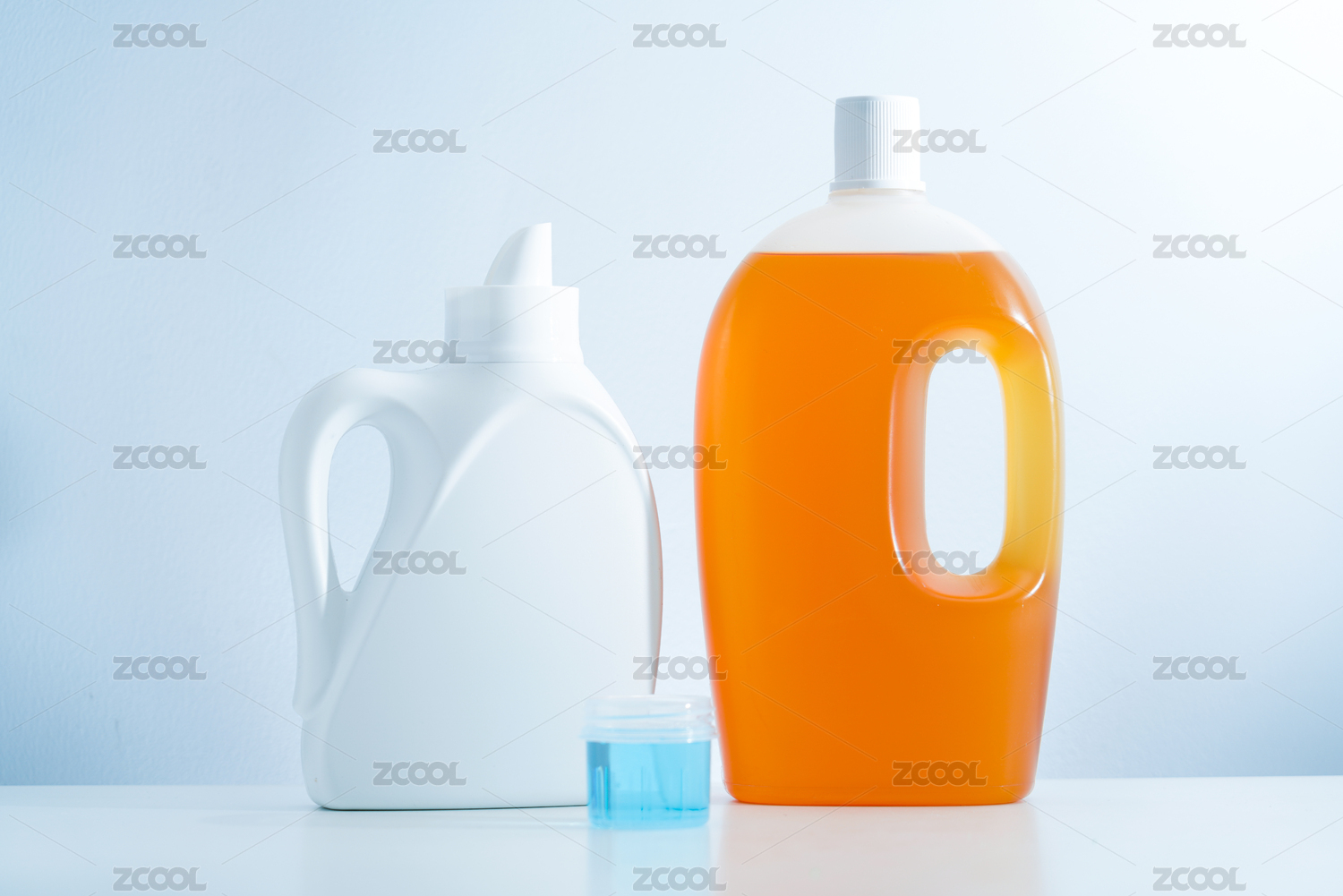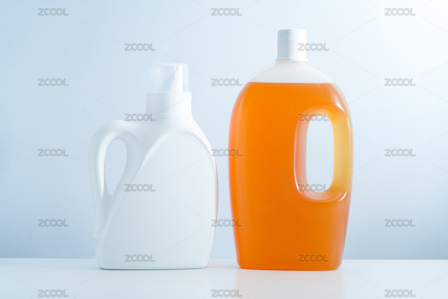 一瓶洗衣液和衣物消毒液放在白色桌面上