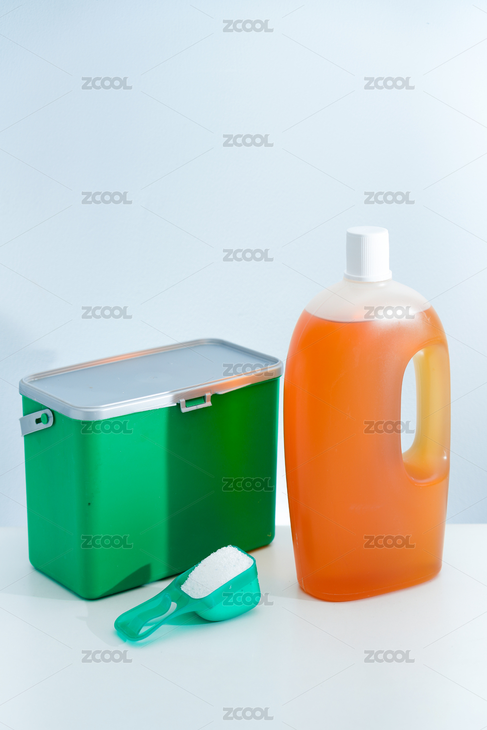 一桶洗衣粉和衣物消毒液放在白色桌面上