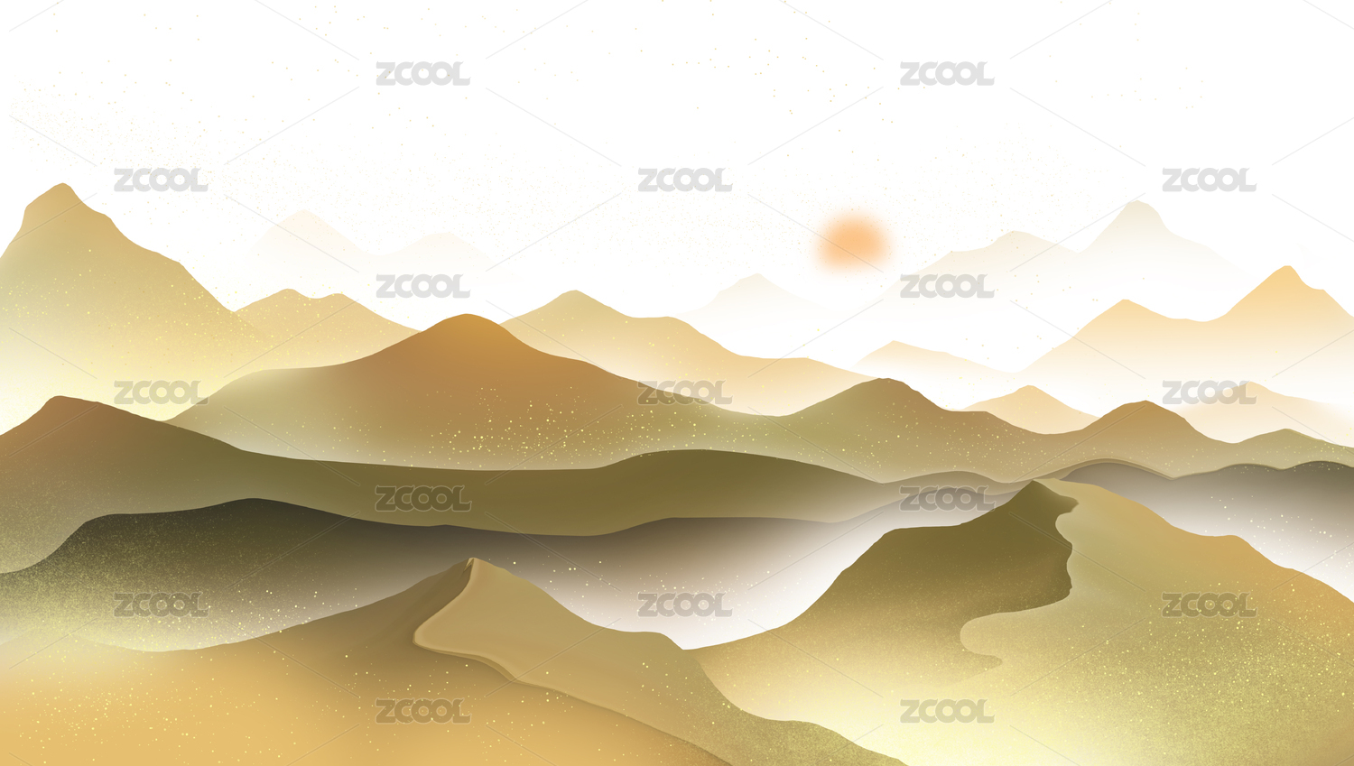 中国风诗意金黄沙漠落日景观风景插画