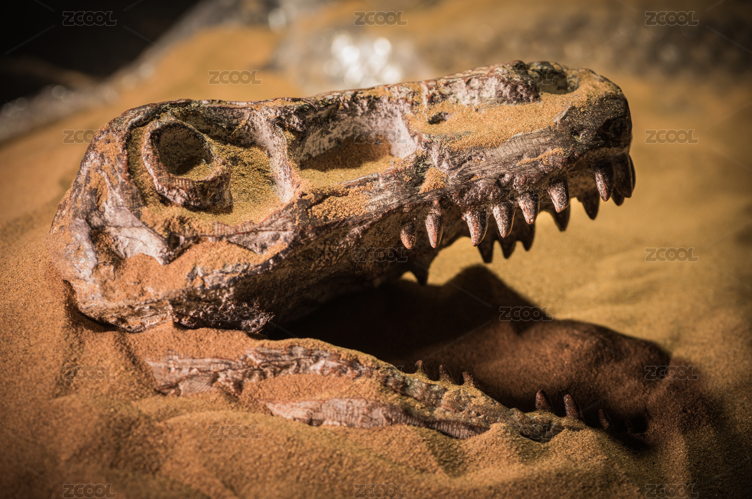 淹没在黄沙中的恐龙迅猛龙头骨化石特写