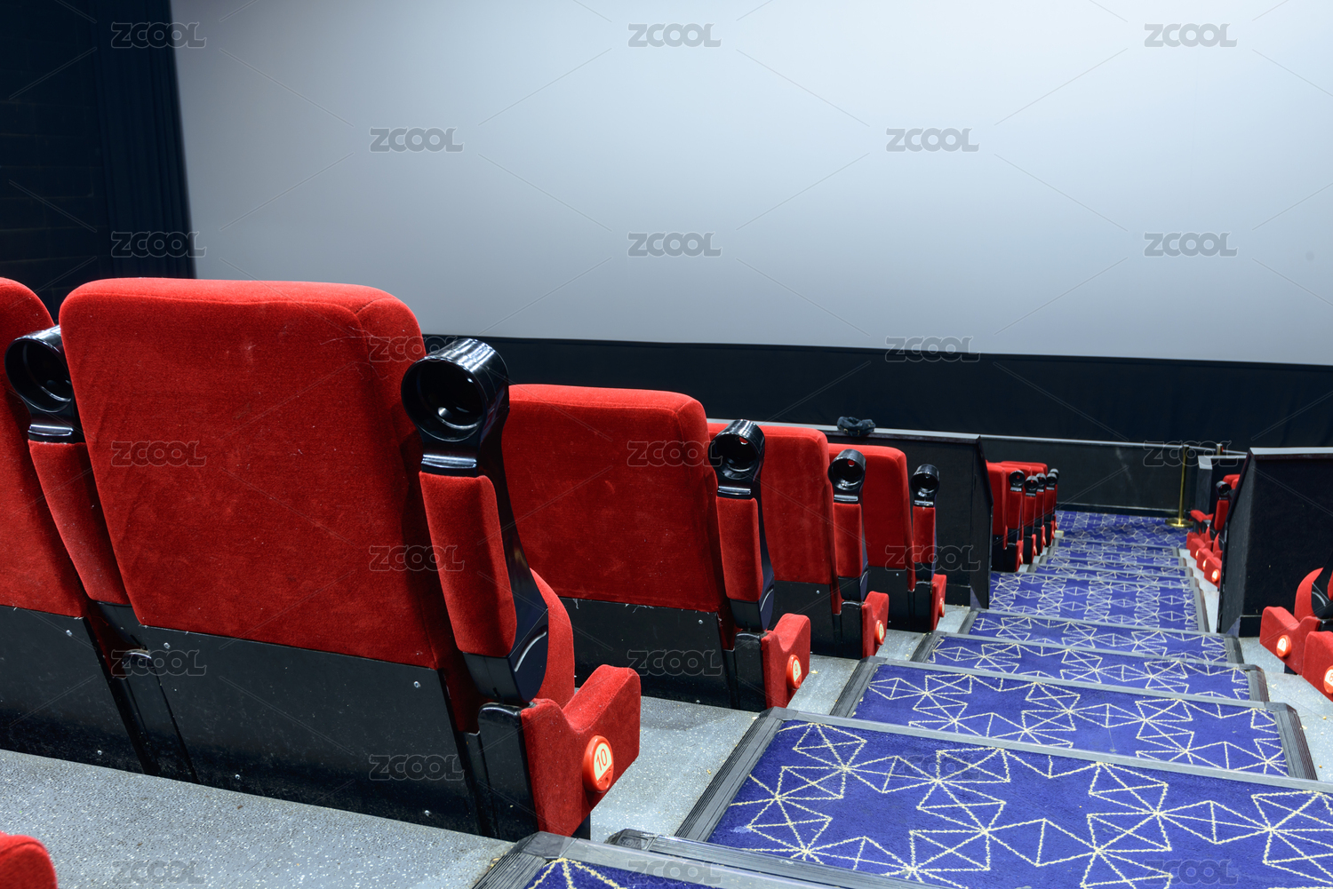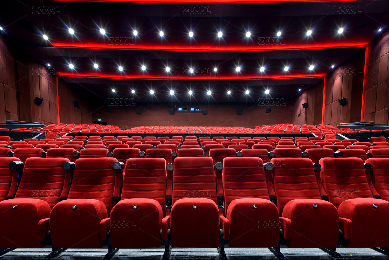 无人的大型的电影放映厅,红色的椅子