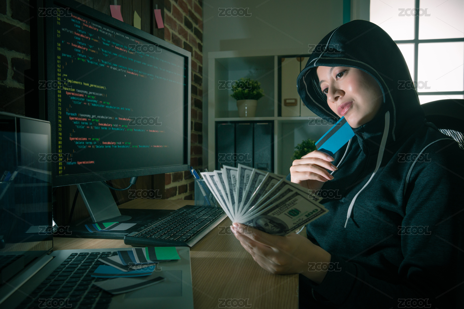 年轻的微笑女黑客看着钞票思考如何使用编程代码窃取信用卡信息和交易。