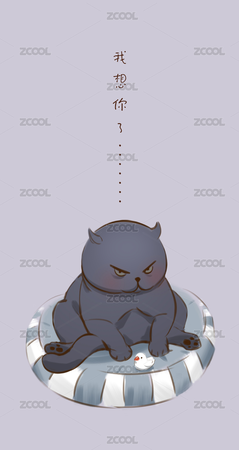 蓝猫坐在泳圈上前面一个小鸭子板绘插画