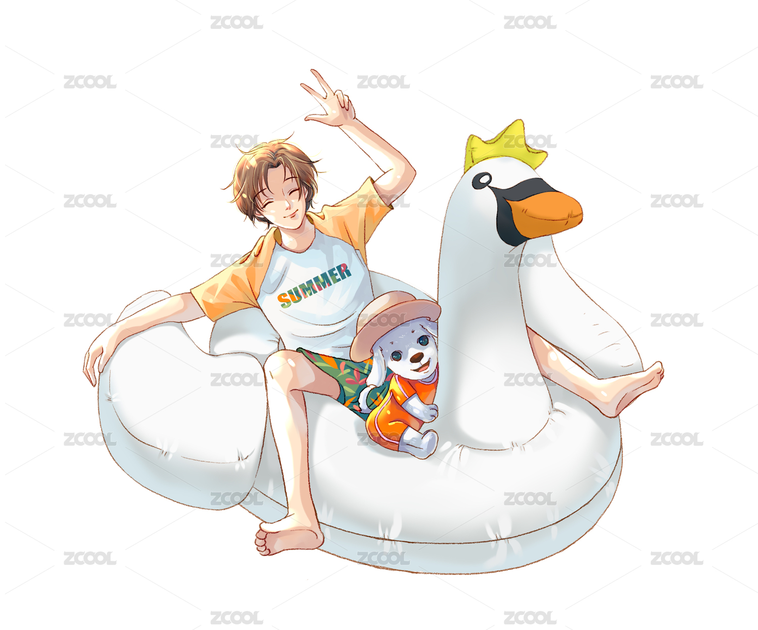 和狗狗坐在天鹅游泳圈的少年