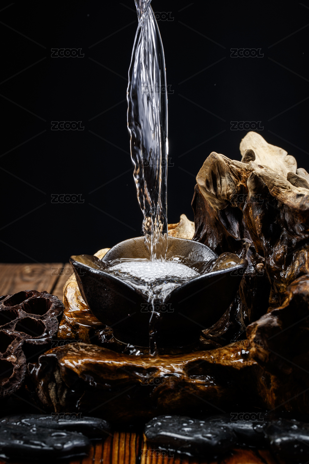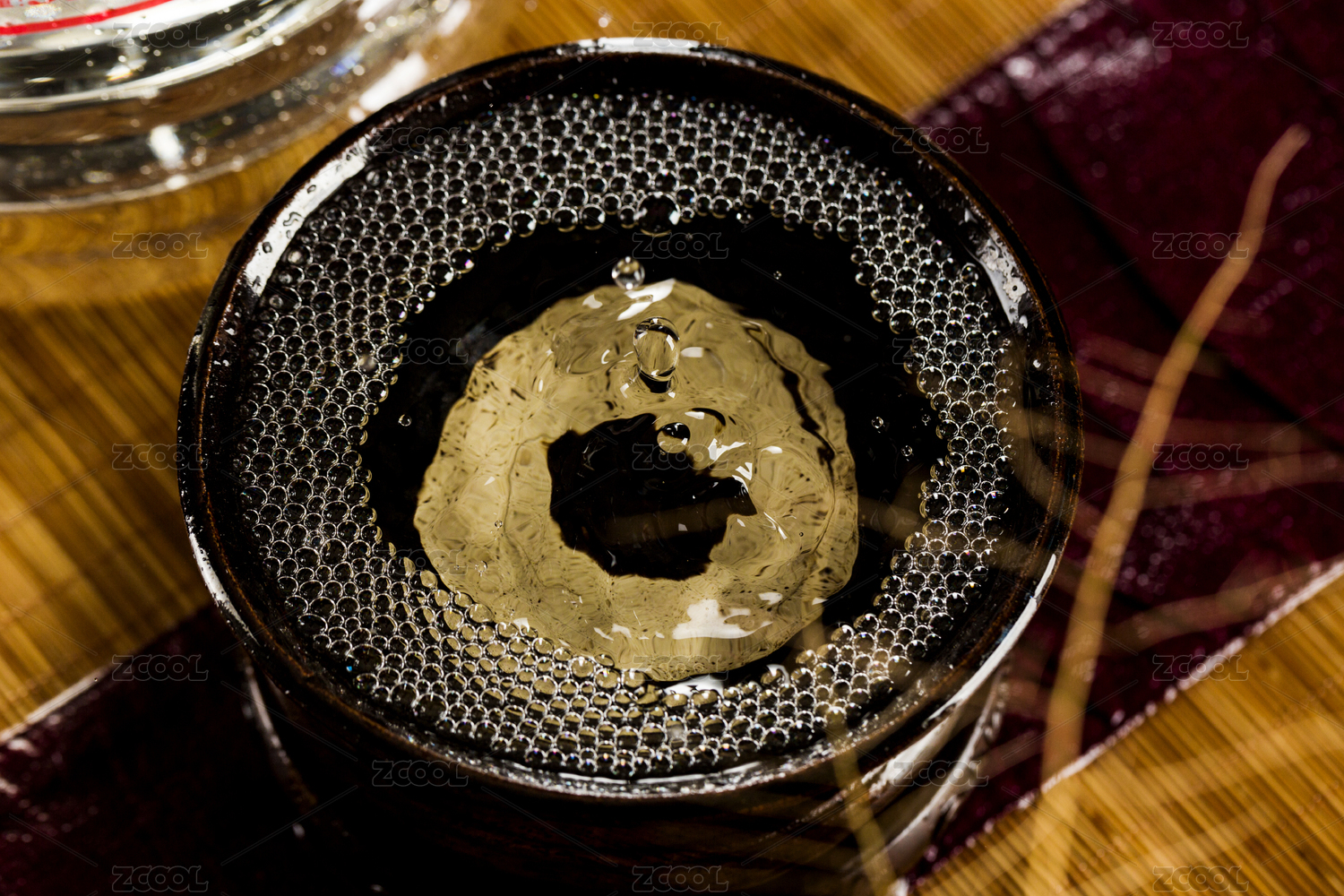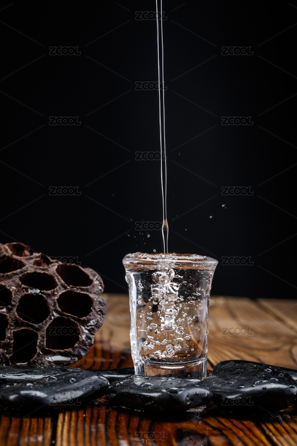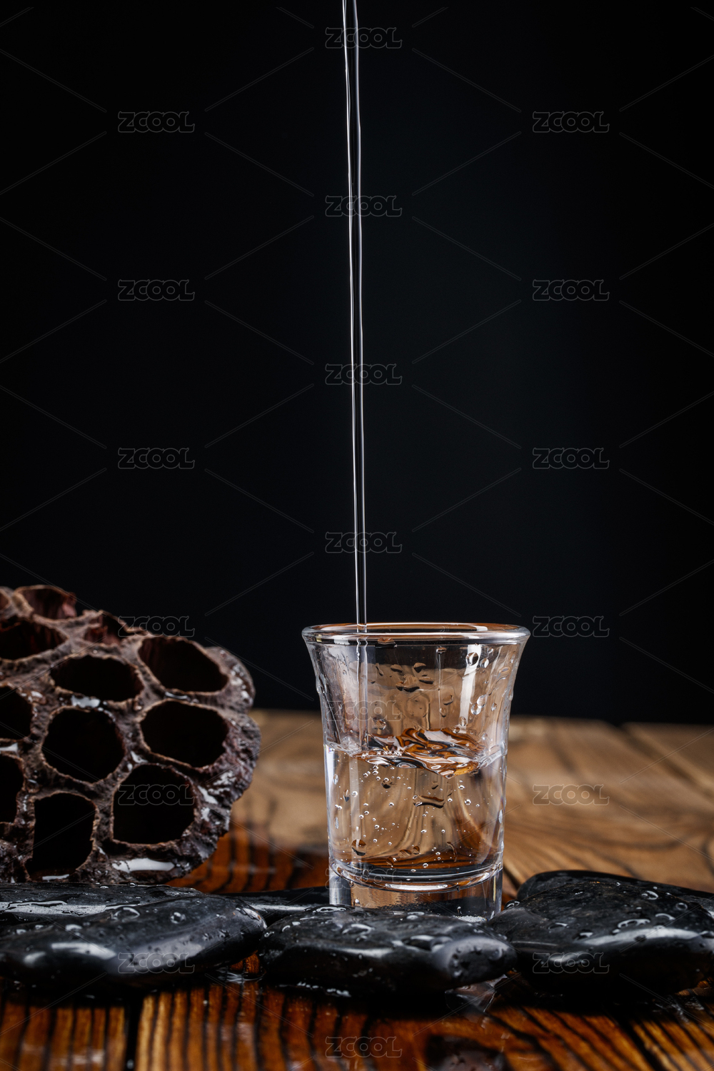 向木板上摆放的酒具内倒入清澈的白酒酒花