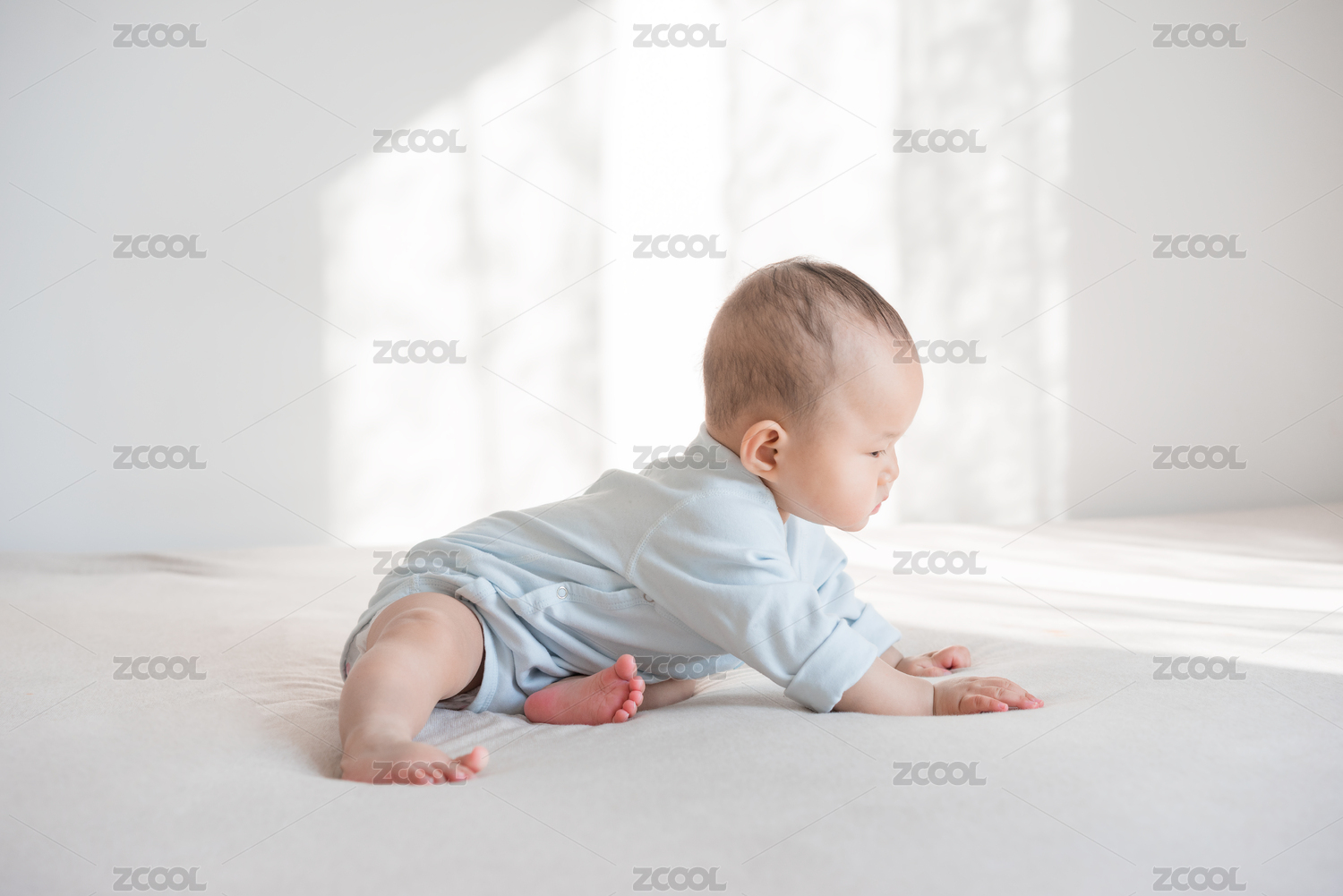 穿粉蓝和尚衣的九个月婴儿趴卧着笑