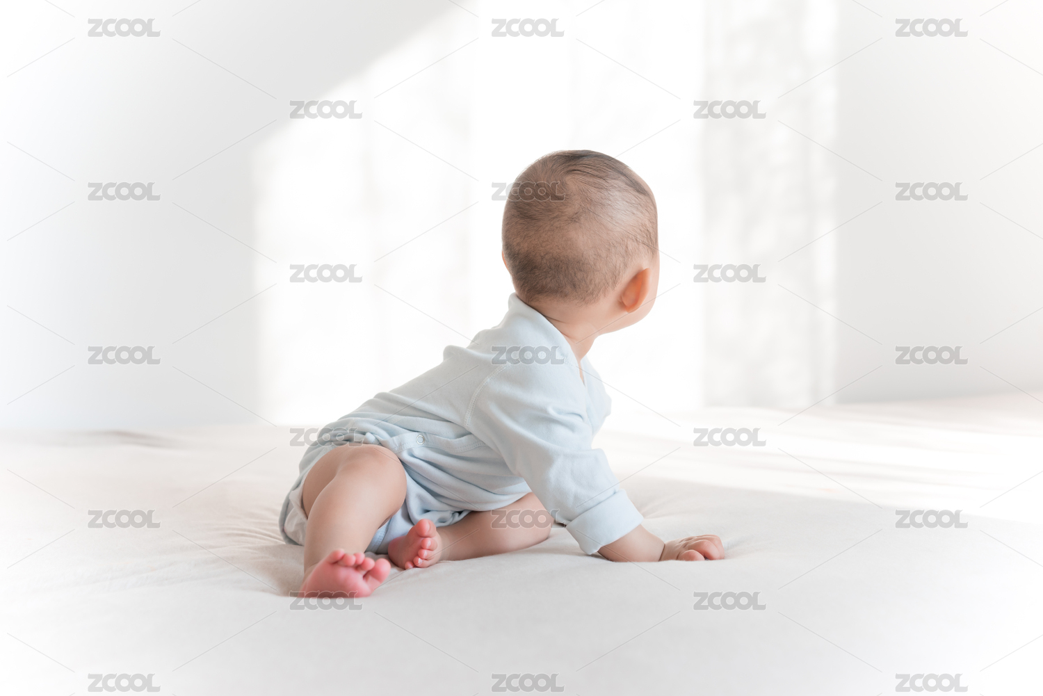穿粉蓝和尚衣的九个月婴儿坐着摸脚