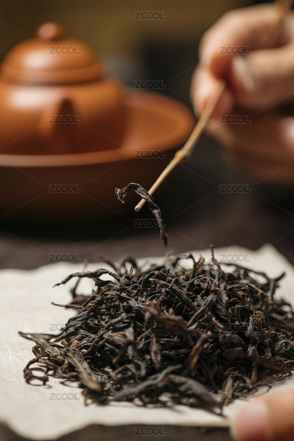 用竹签整理放在托纸上的茶叶展示