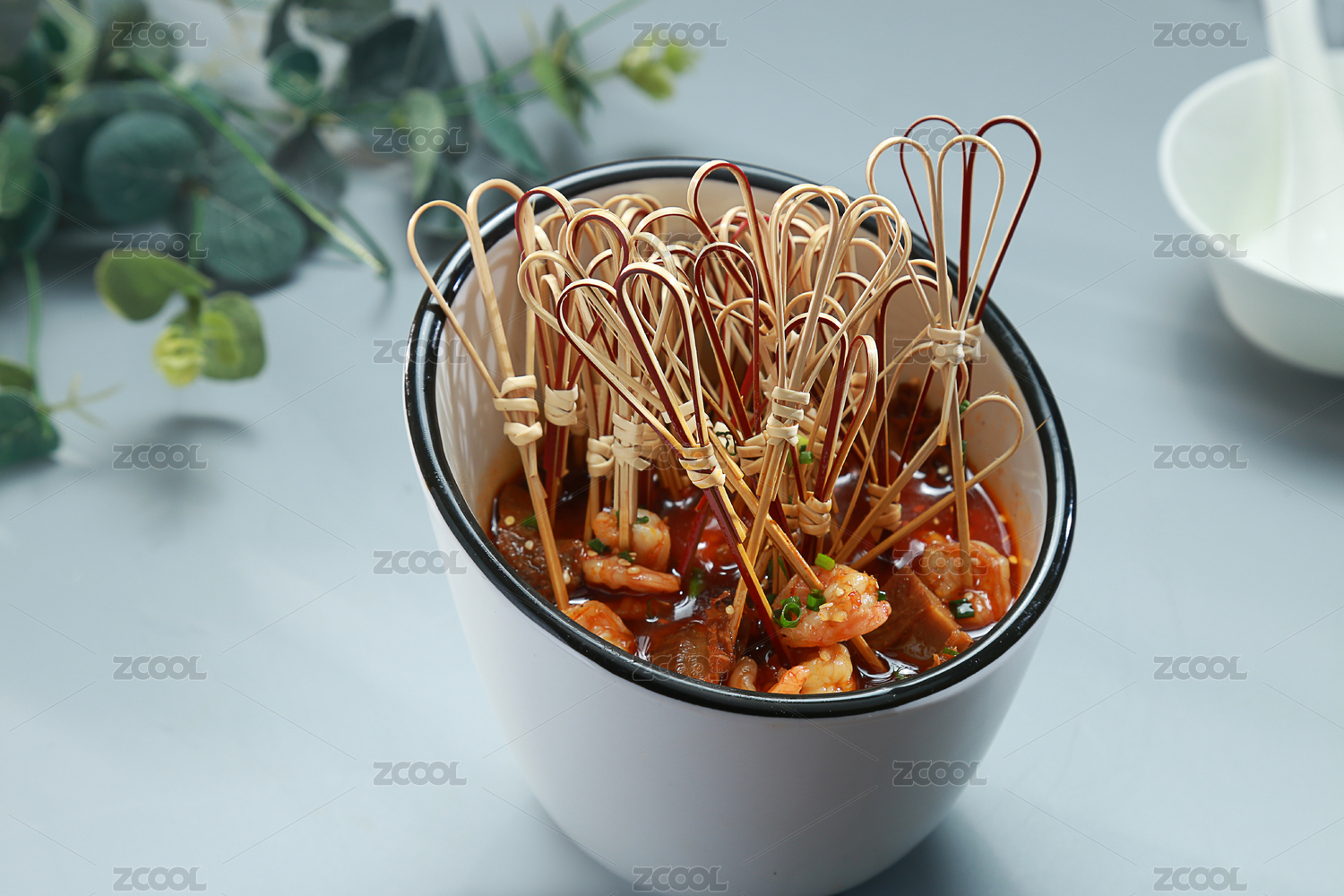 浅灰色背景上斜口瓷盘中的串串
