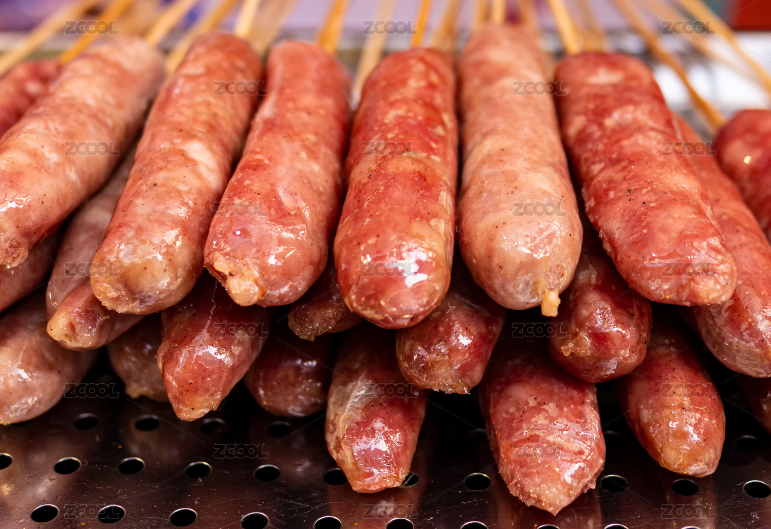 正在烤制的一堆竹签穿的红色烤肠