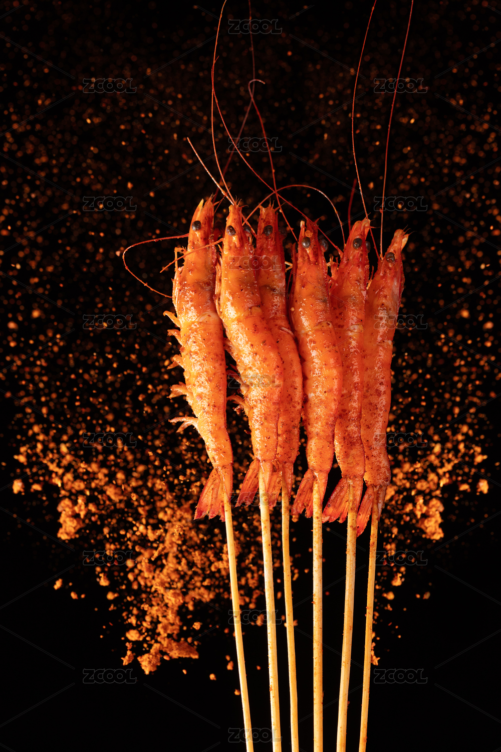 黑色背景烧烤竹签串着的麻辣烤串串烤虾