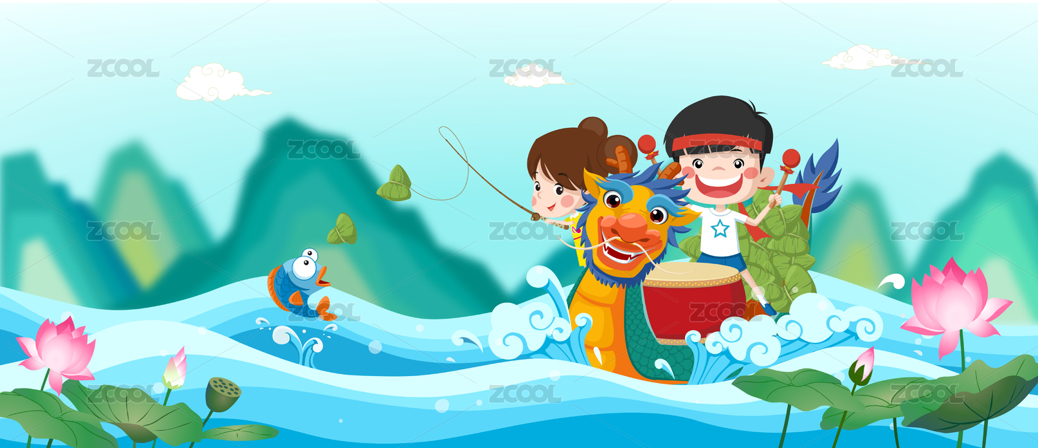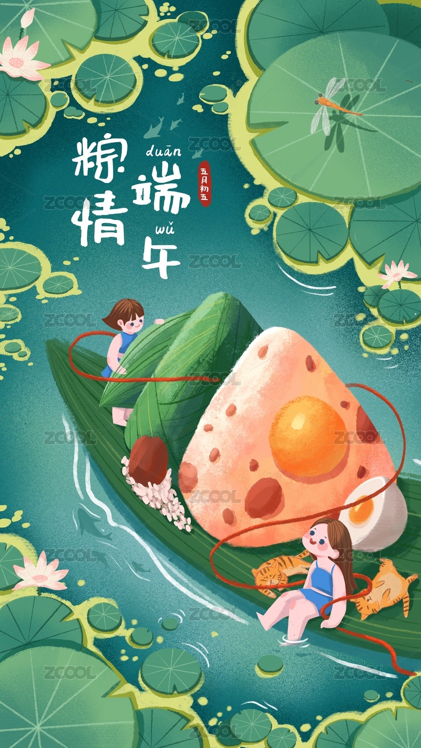 端午节划龙舟浪花插画传统国潮节日粽子海报