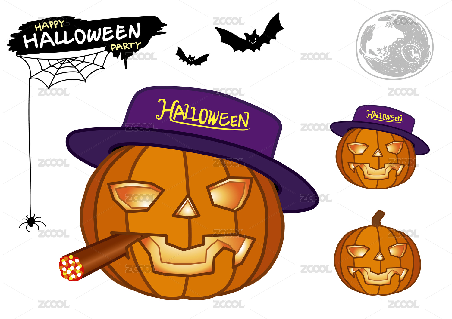 万圣节南瓜灯蝙蝠蜘蛛网矢量插画