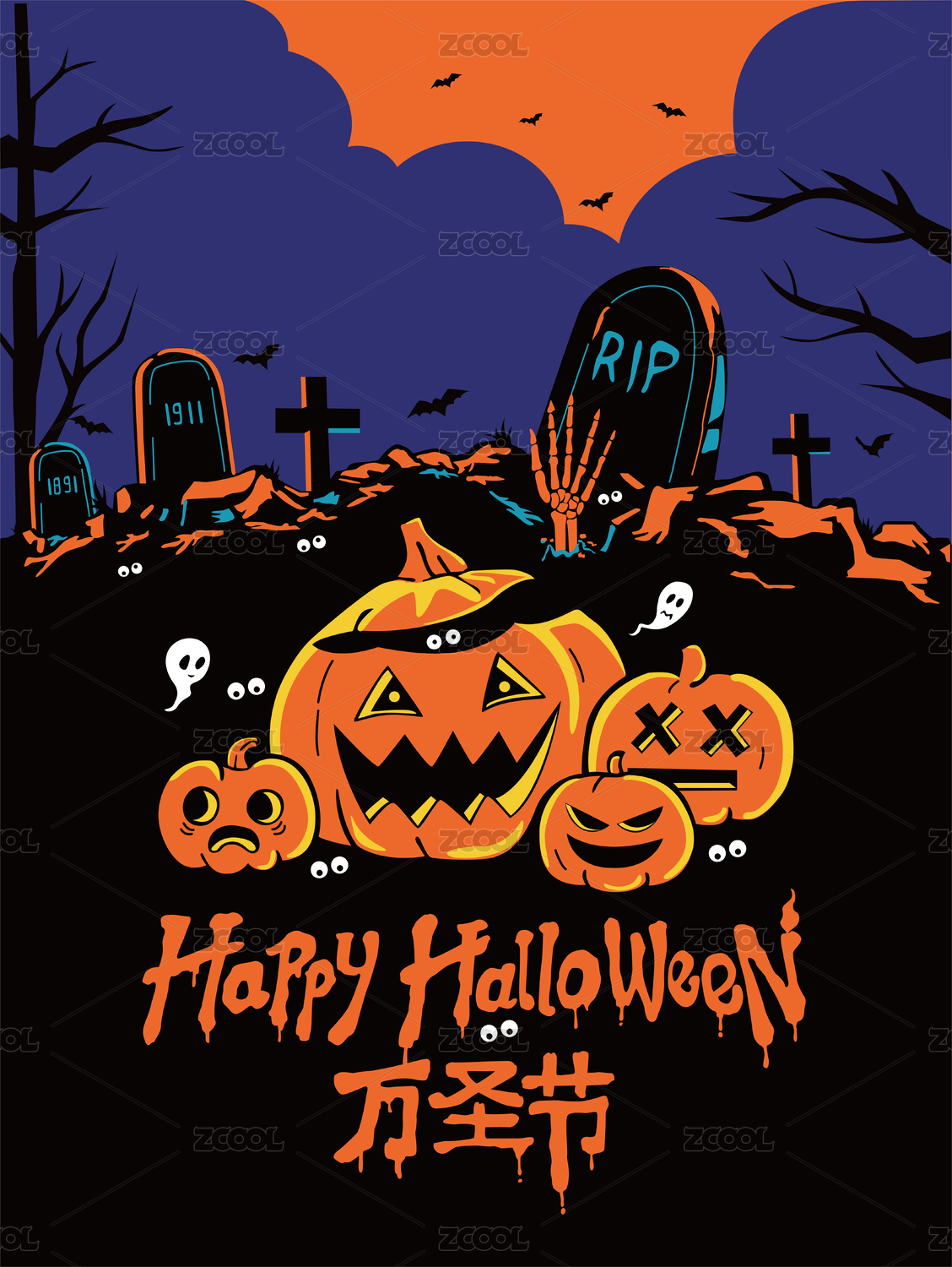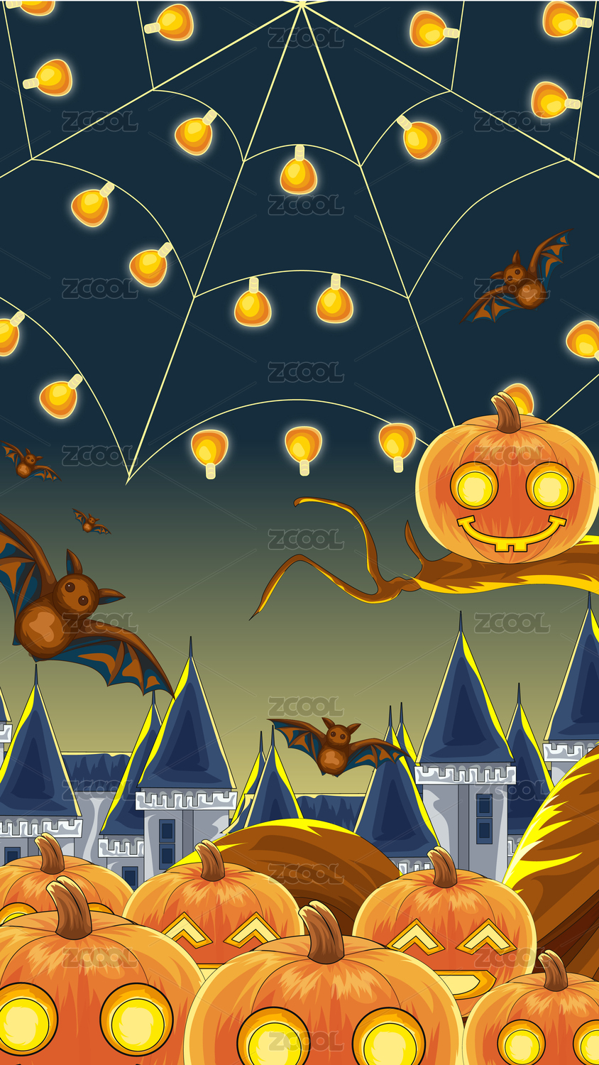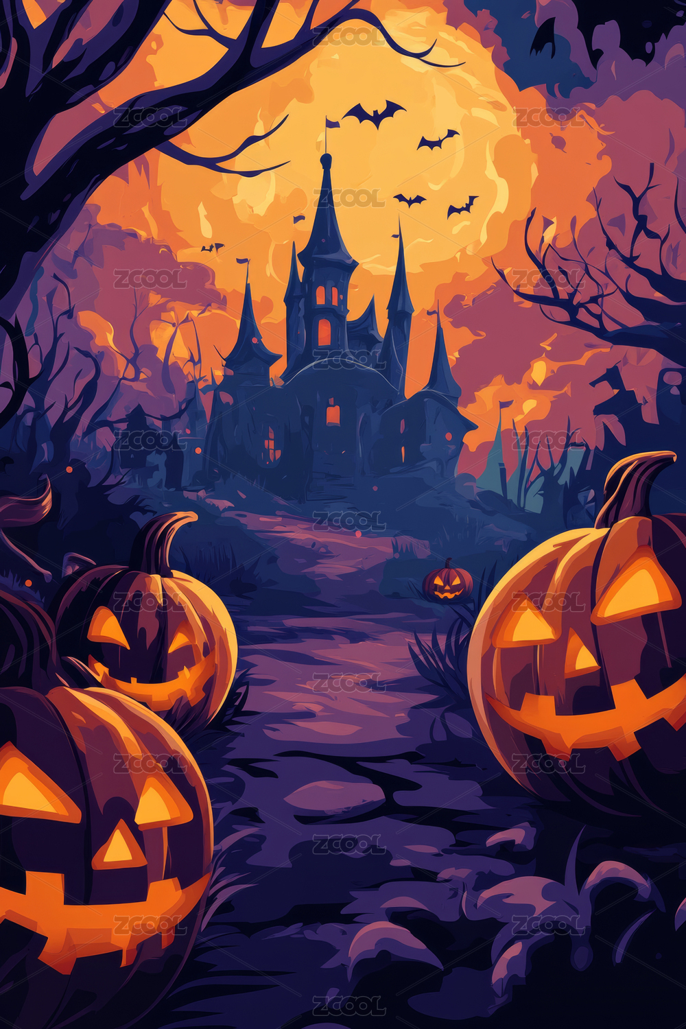 万圣节月夜城堡南瓜灯插画节日魔幻派对海报