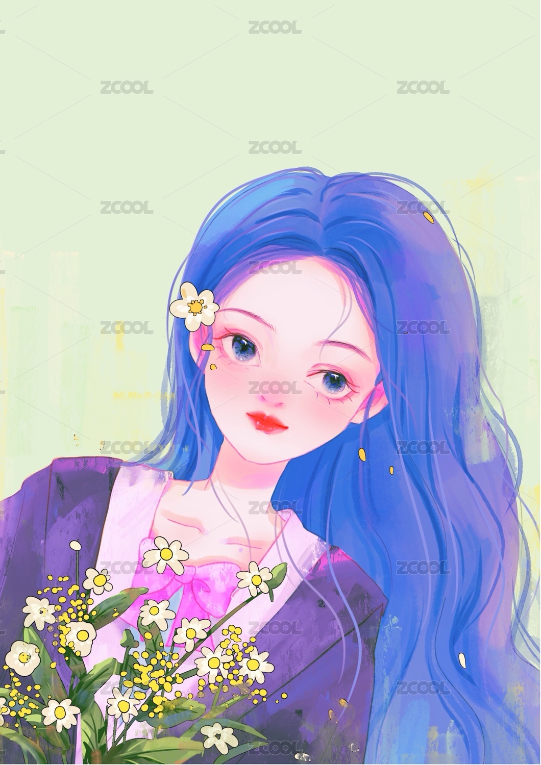 蓝发少女拿捧花