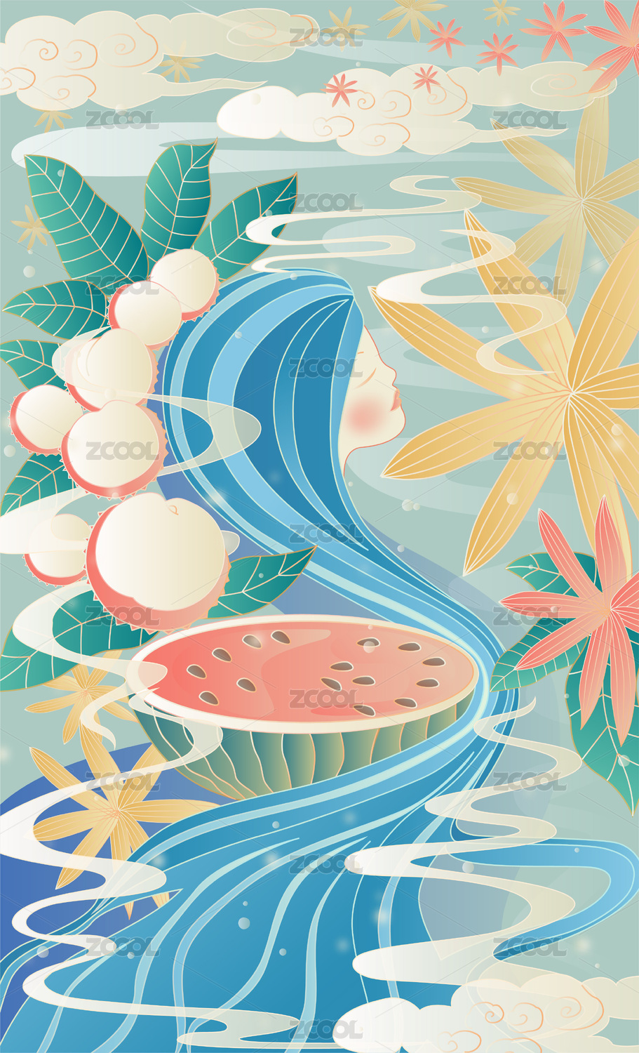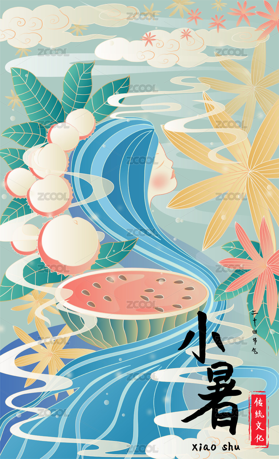 二十四节气小暑蓝发美女西瓜荔枝中国风插画