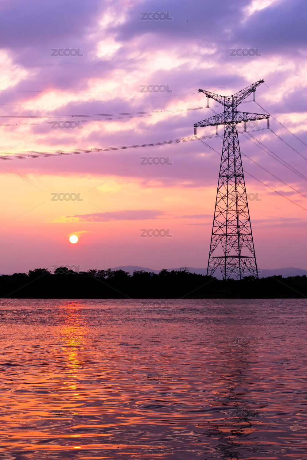 高压电线塔日落时的剪影