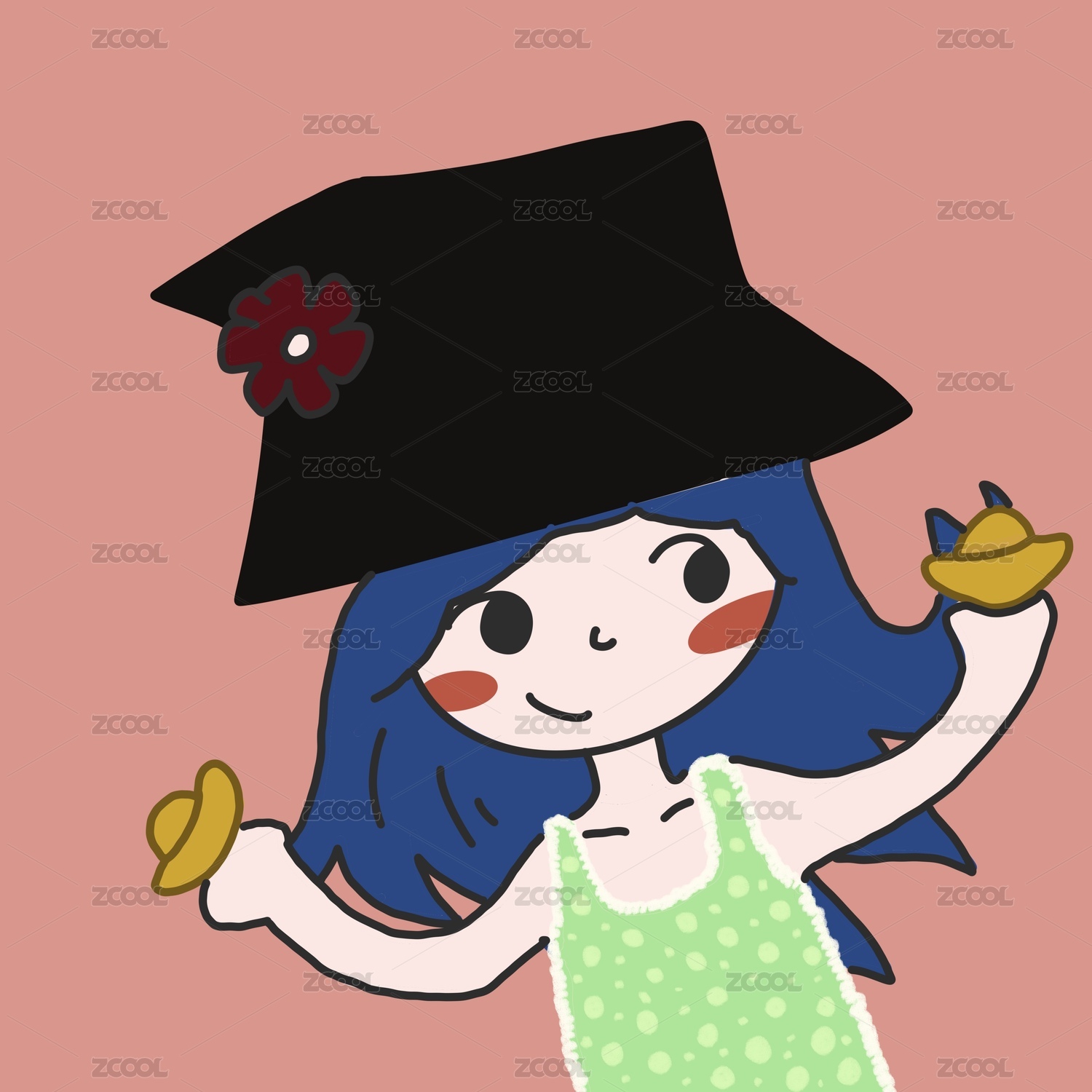 身穿小花裙手持金元宝可爱蓝发小妹妹