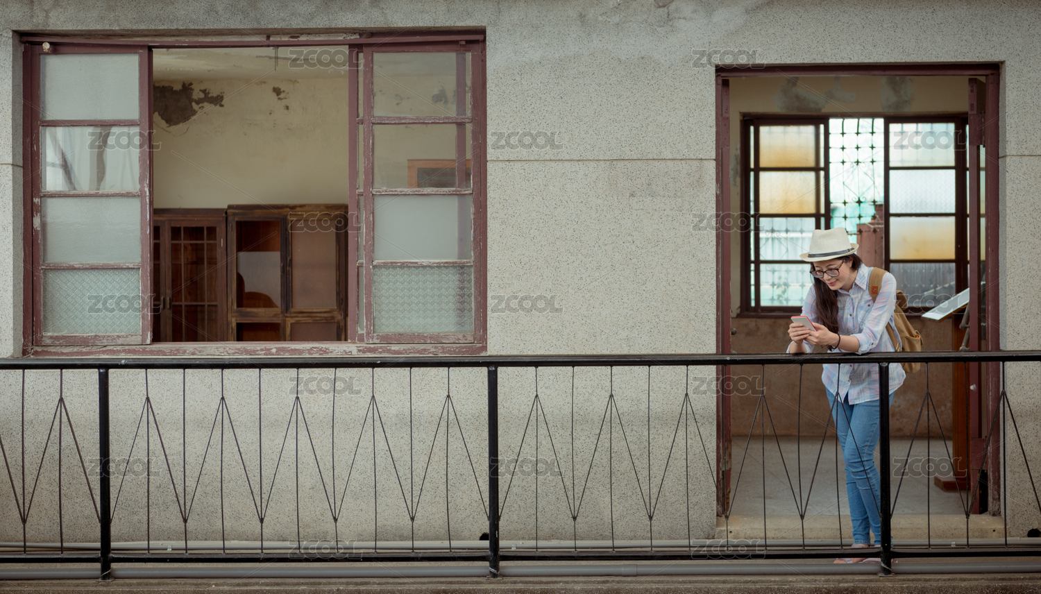 美丽的微笑的女学生旅游使用移动电话技术的产品寻找通过网上指南当地的旅游信息,历史传统建筑屹立不倒。
