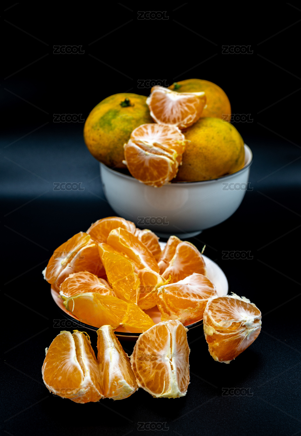 黑底上木盘里放着一堆砂糖橘和切面砂糖桔
