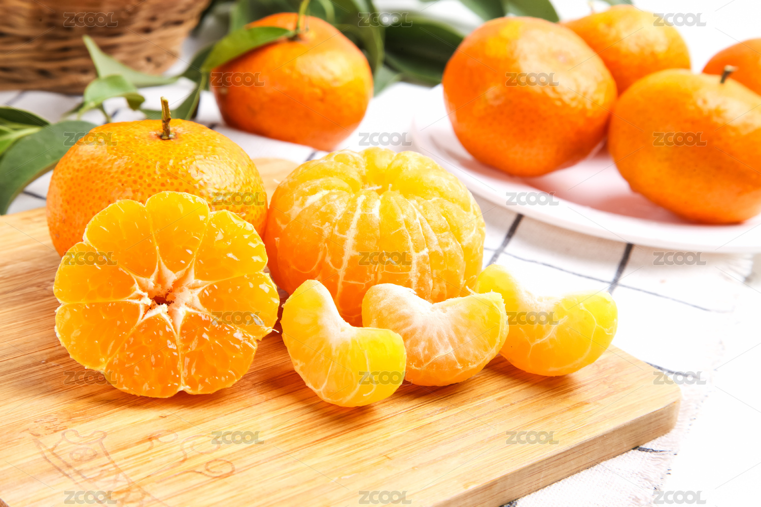 木板上放着一堆砂糖橘和剥皮的蜜橘