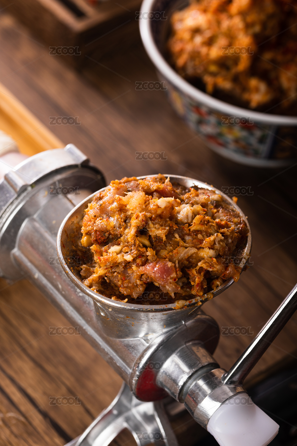 固定在桌子上的灌肠机和灌了一半的香肠腊肠