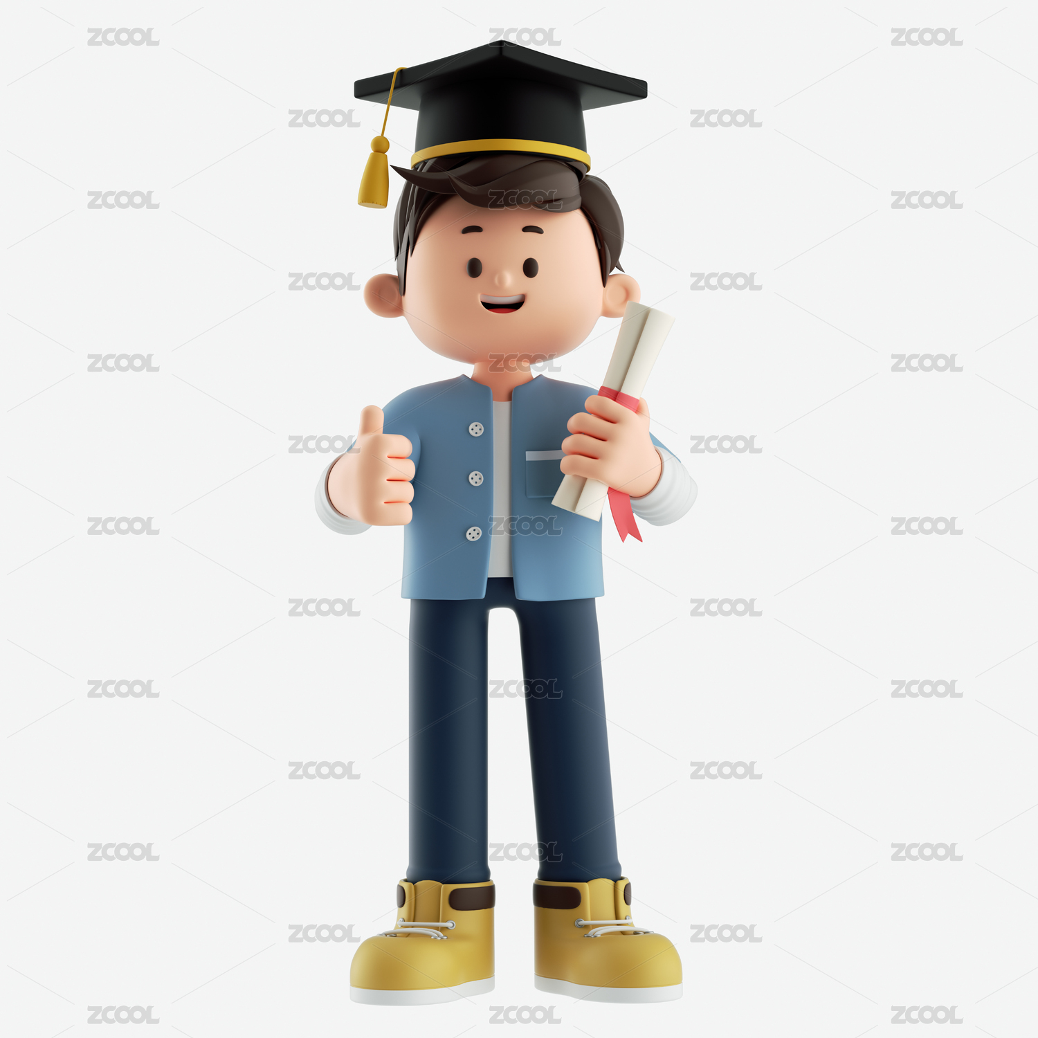 3D卡通男孩学生戴着学士帽拿着毕业证书