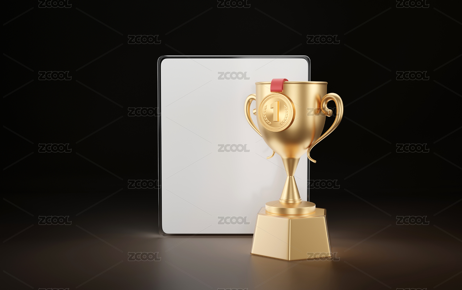 黑色背景前挂着金牌的奖杯与白色证书组合