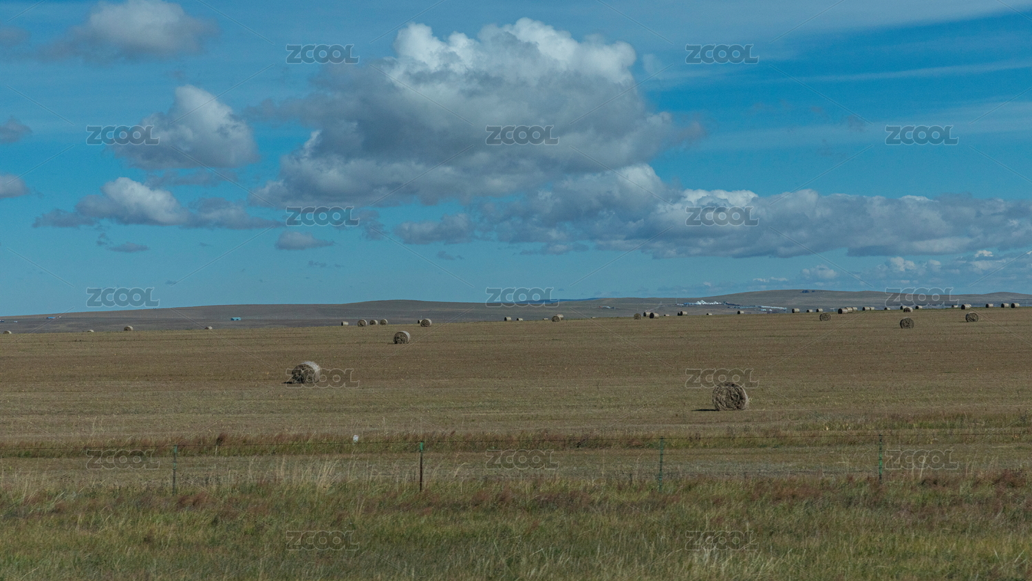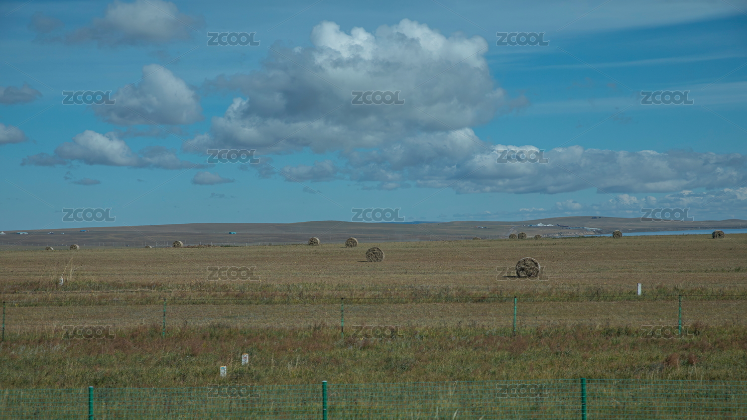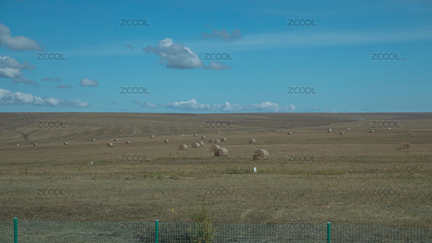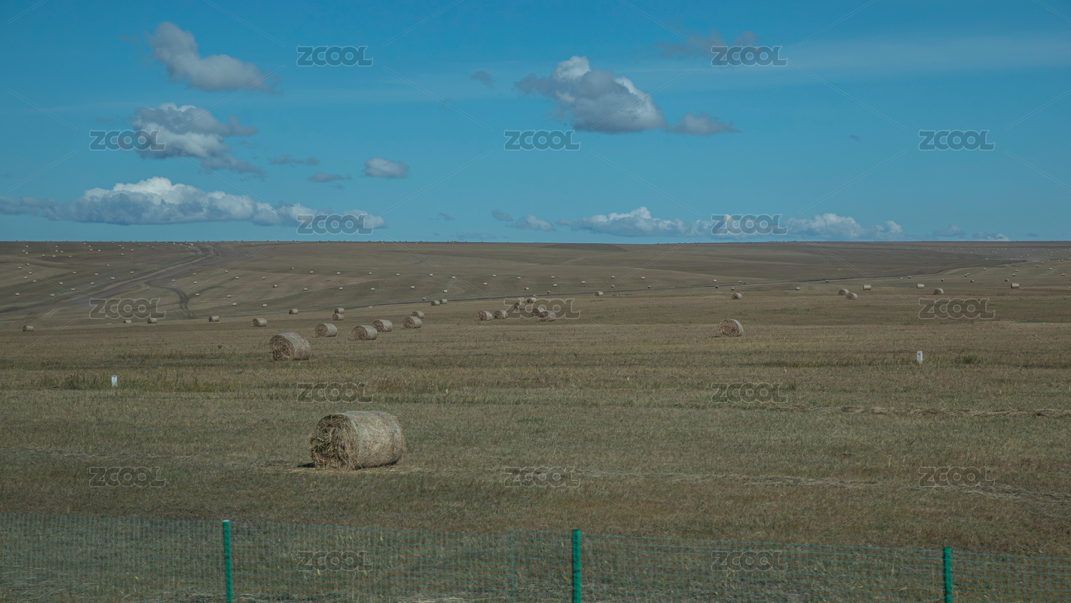 中国呼伦贝尔蓝天白云衬托辽阔草原上的草垛
