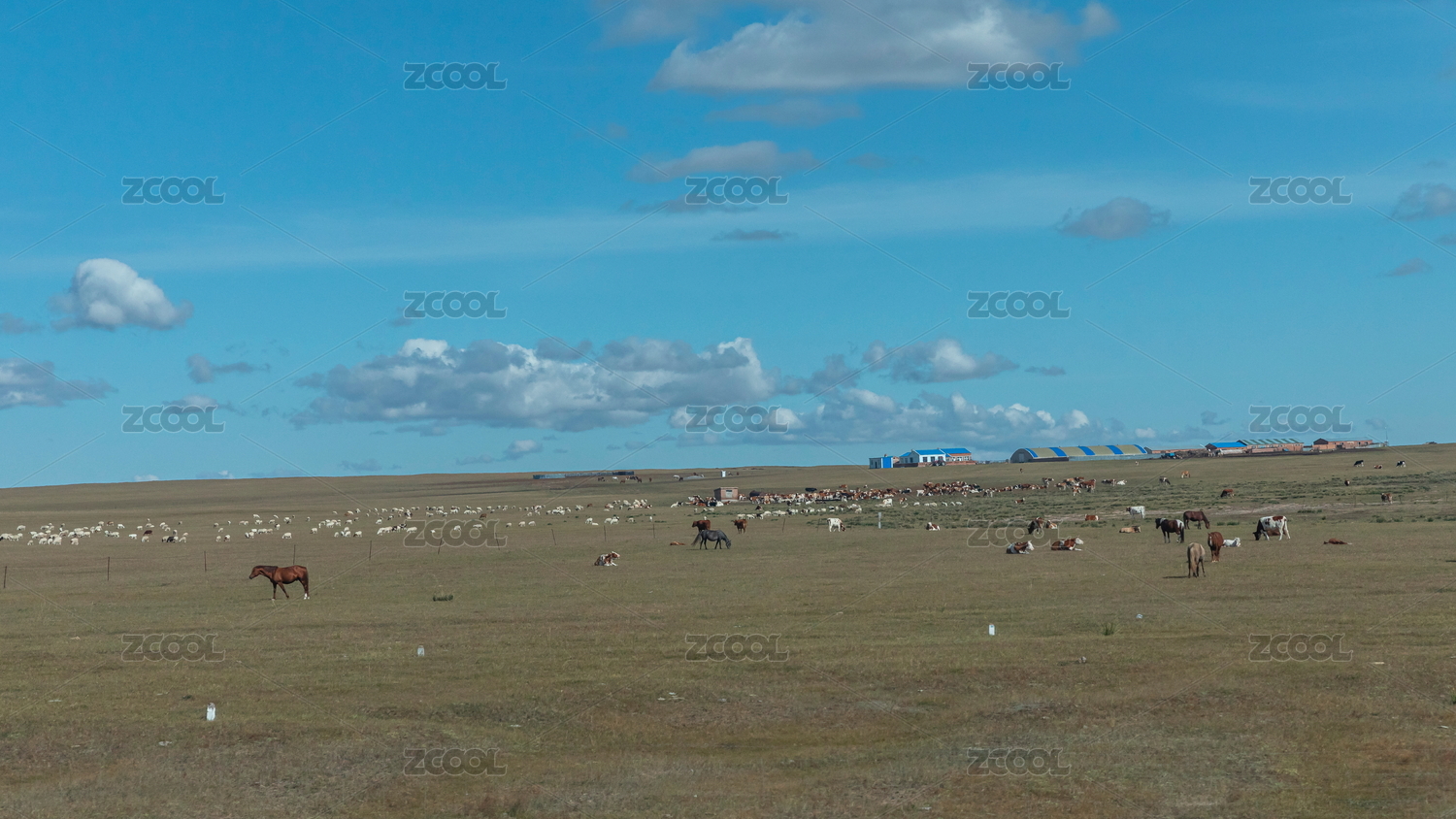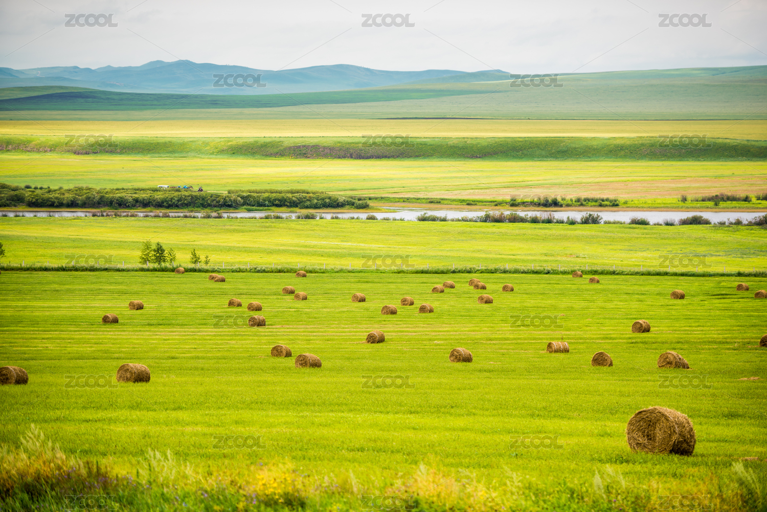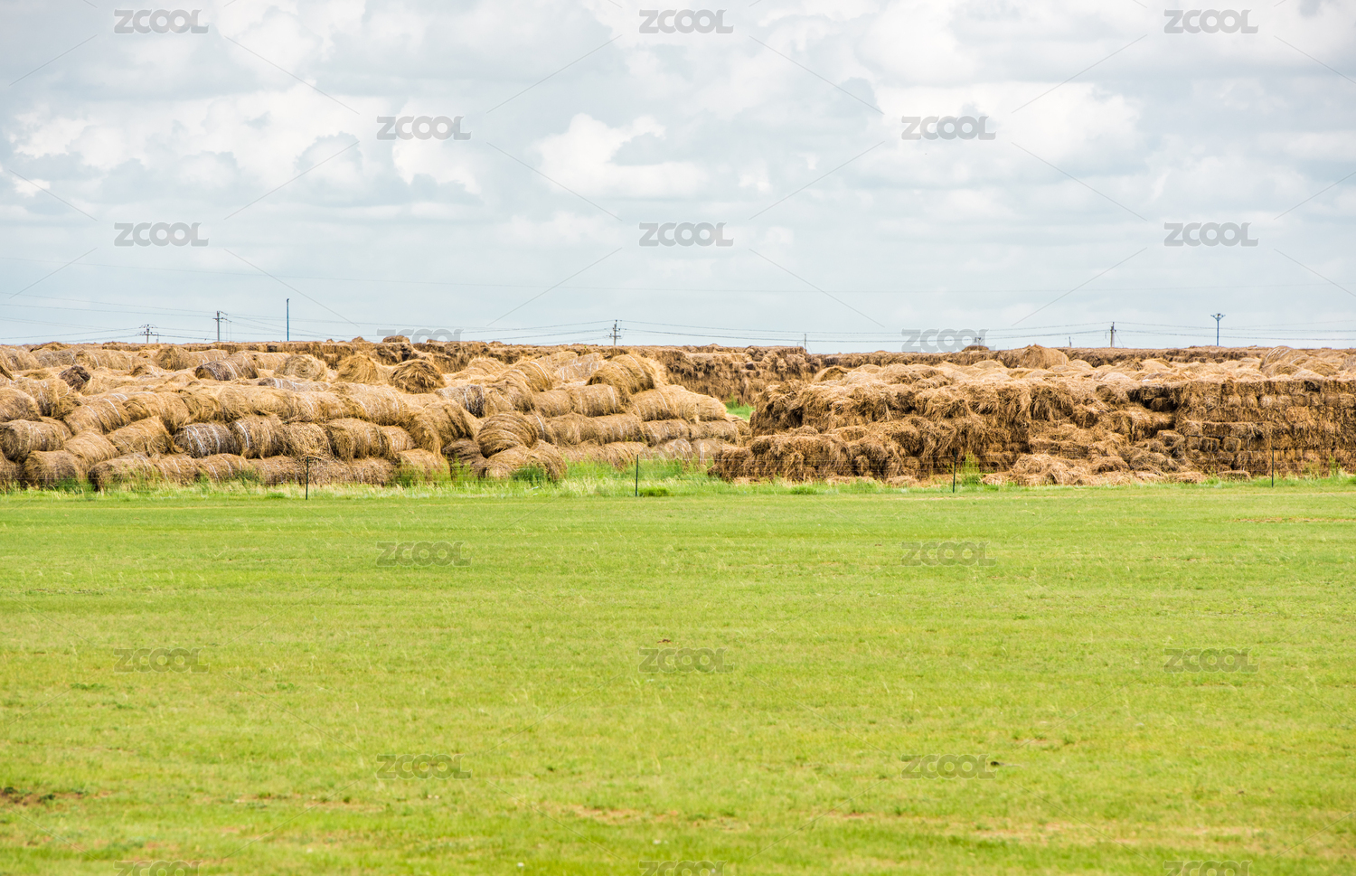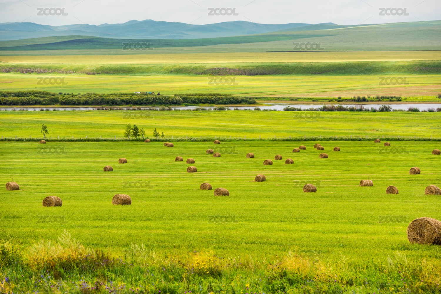 中国呼伦贝尔蓝天白云衬托辽阔草原上的草垛