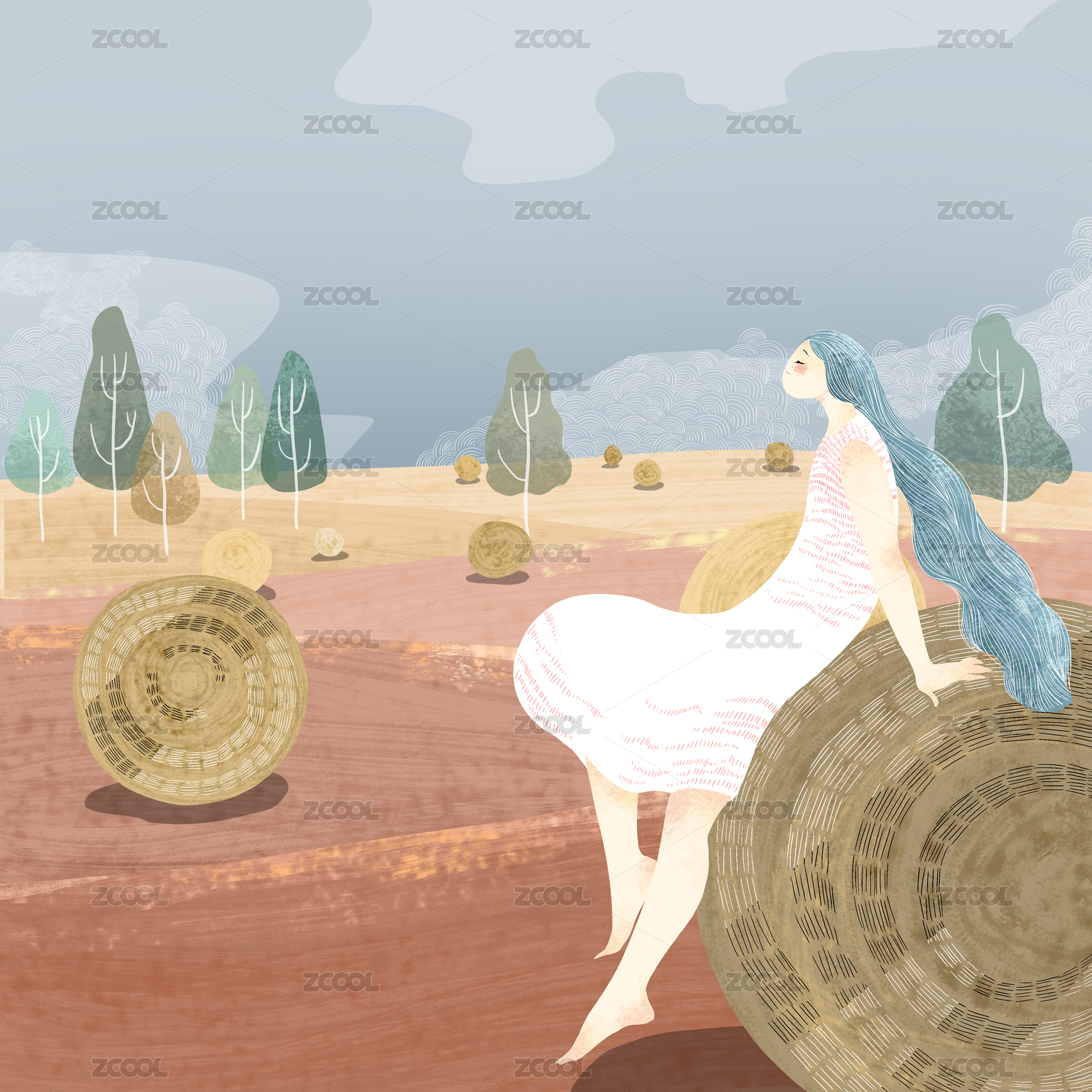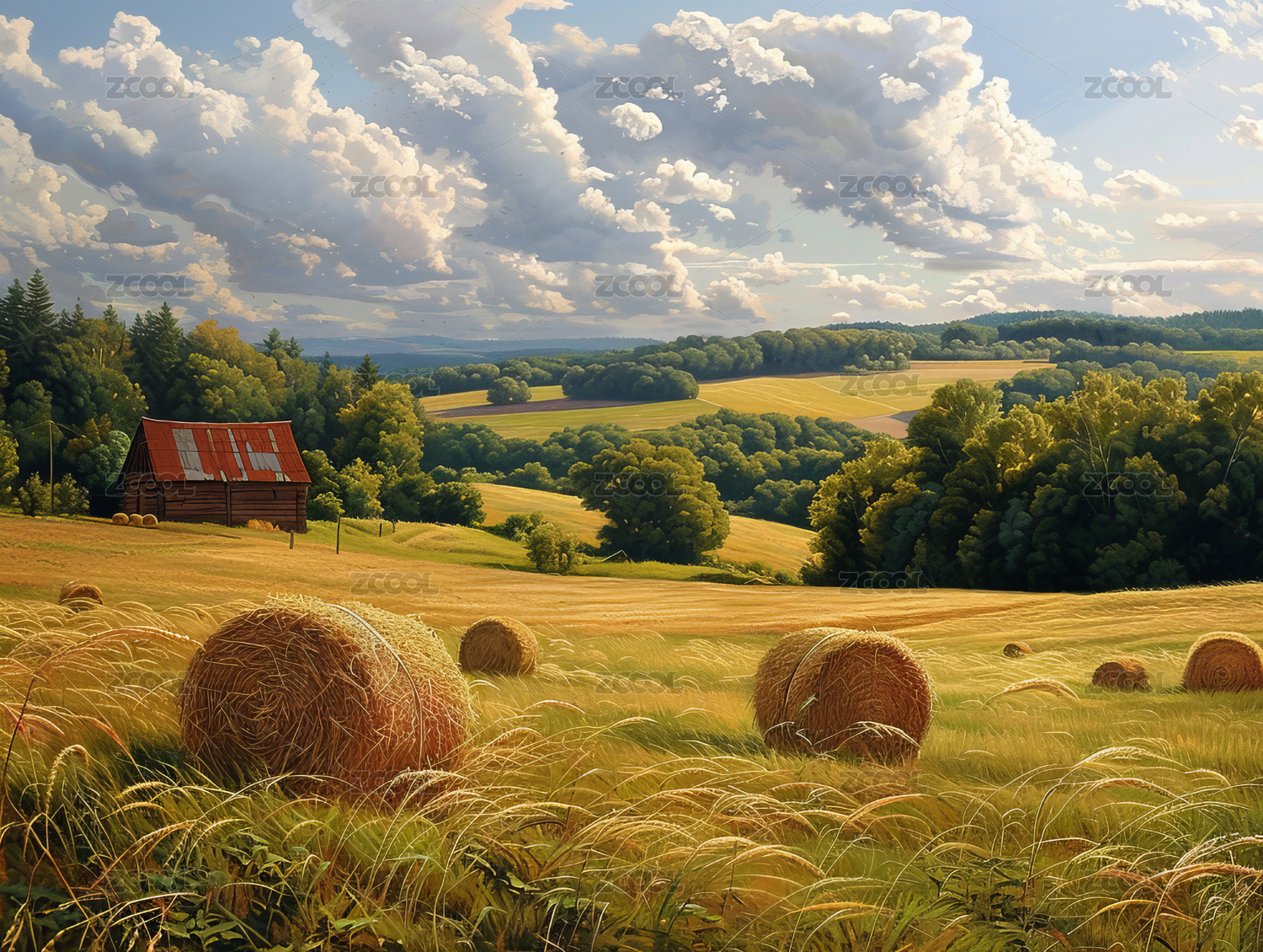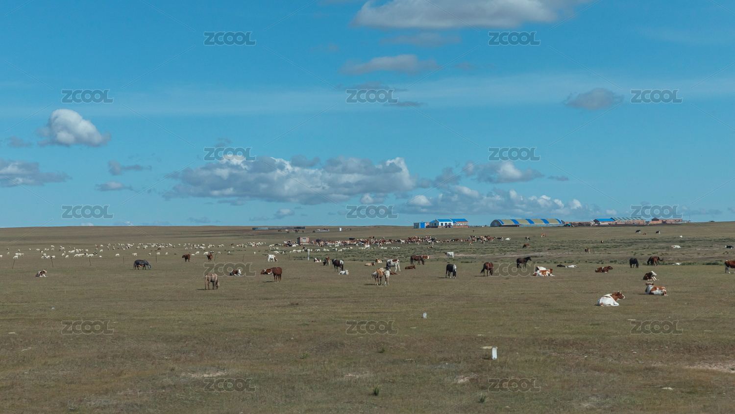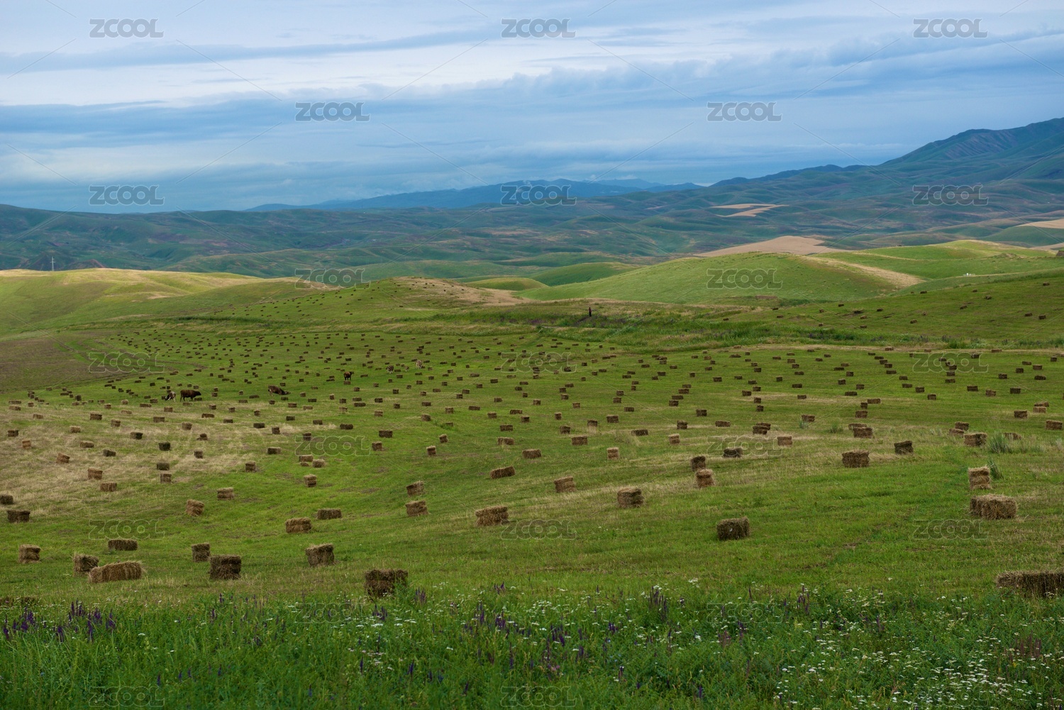 中国呼伦贝尔蓝天白云衬托辽阔草原上的草垛