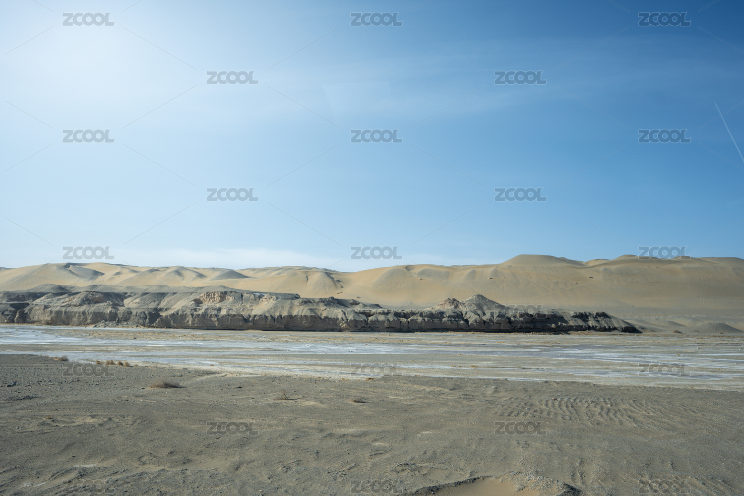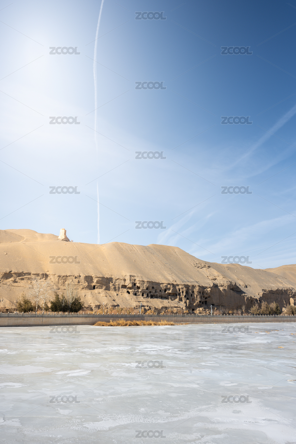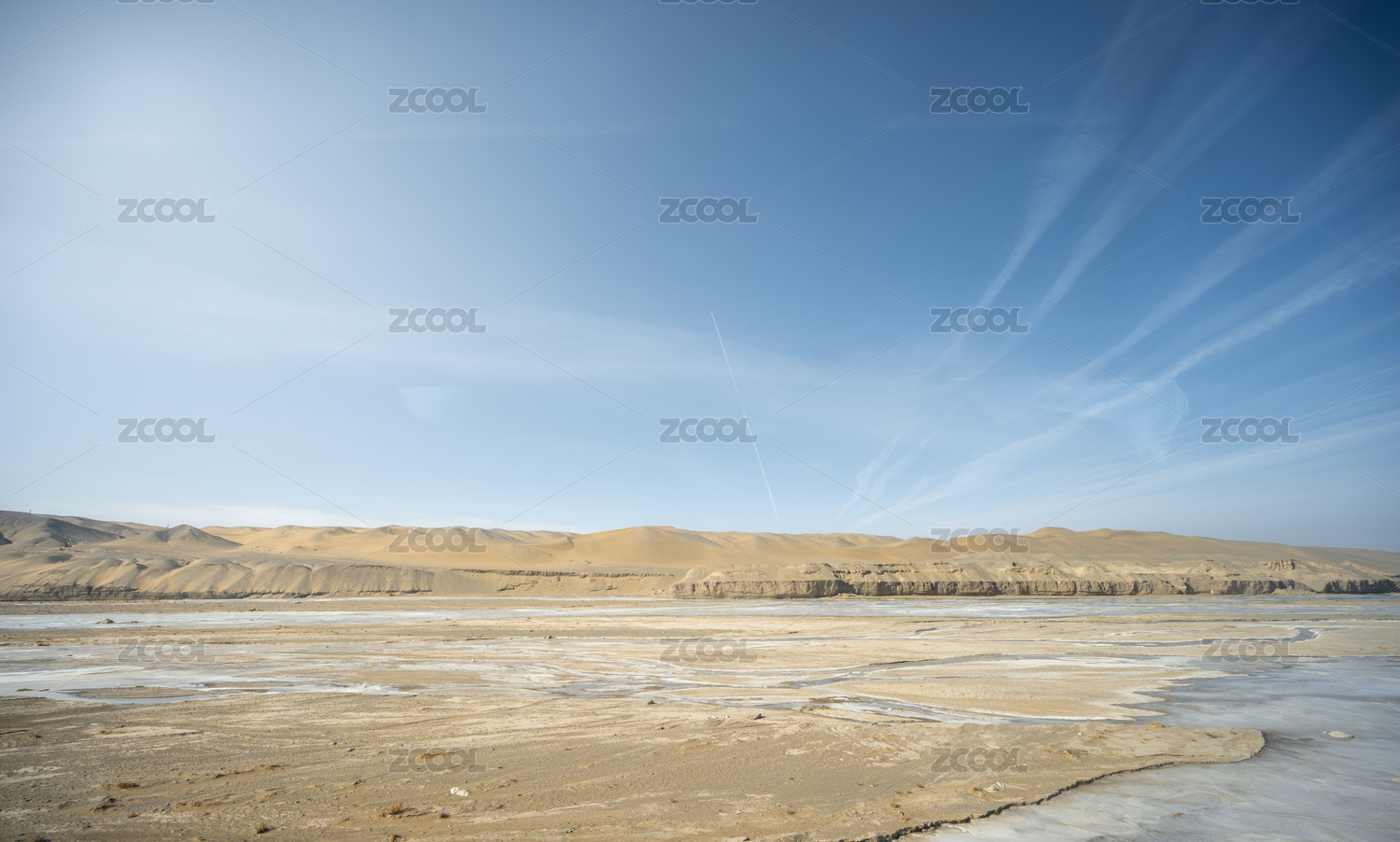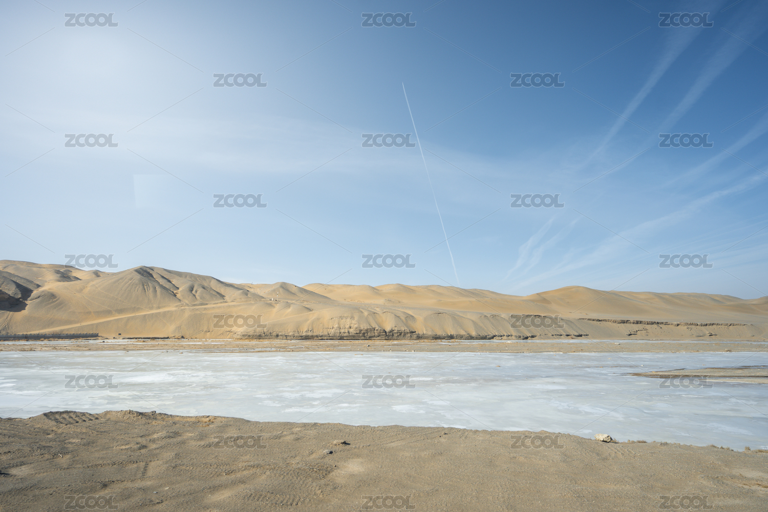 甘肃酒泉莫高窟沙漠中的冰封湖面与沙丘