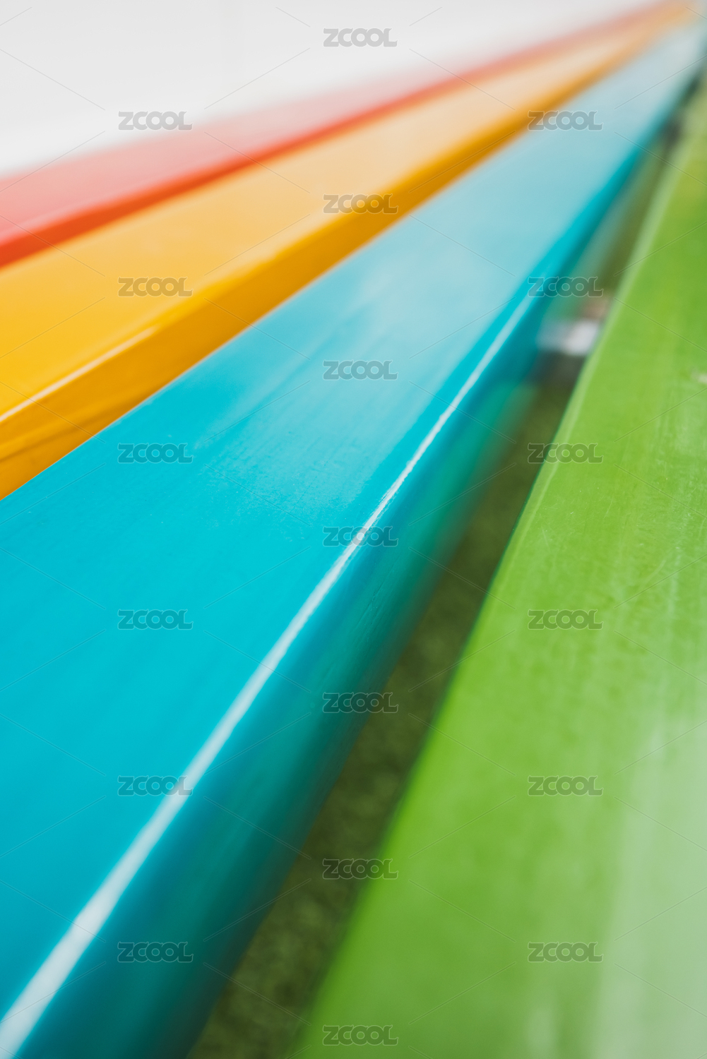 户外公园彩色木制长椅局部特写