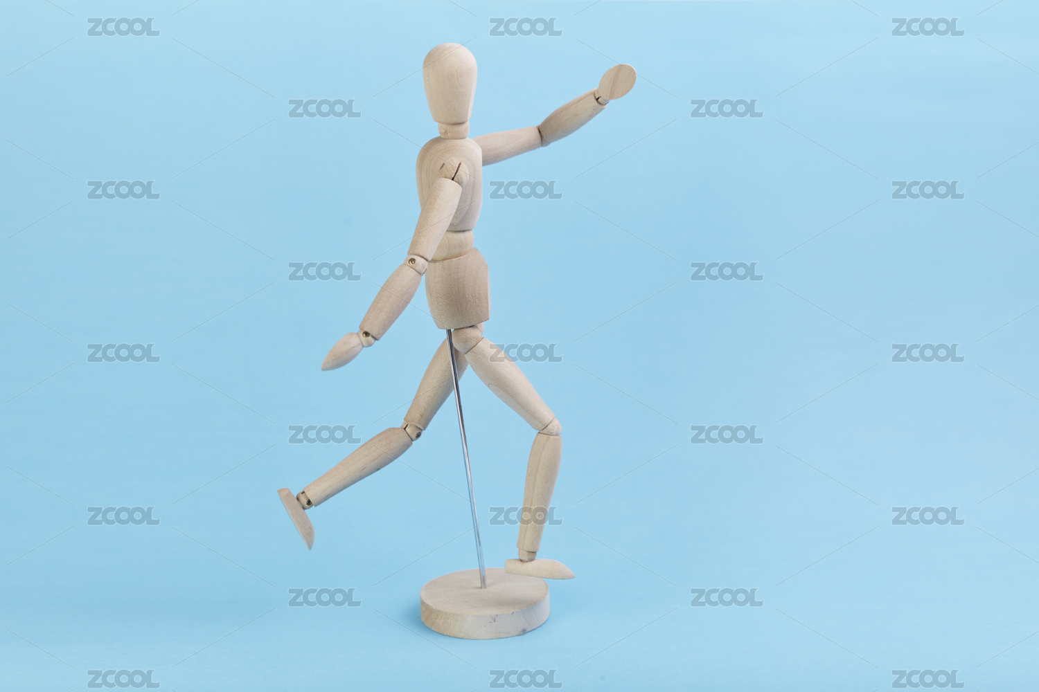 白色环境中在石板阶梯上前进的木头人偶