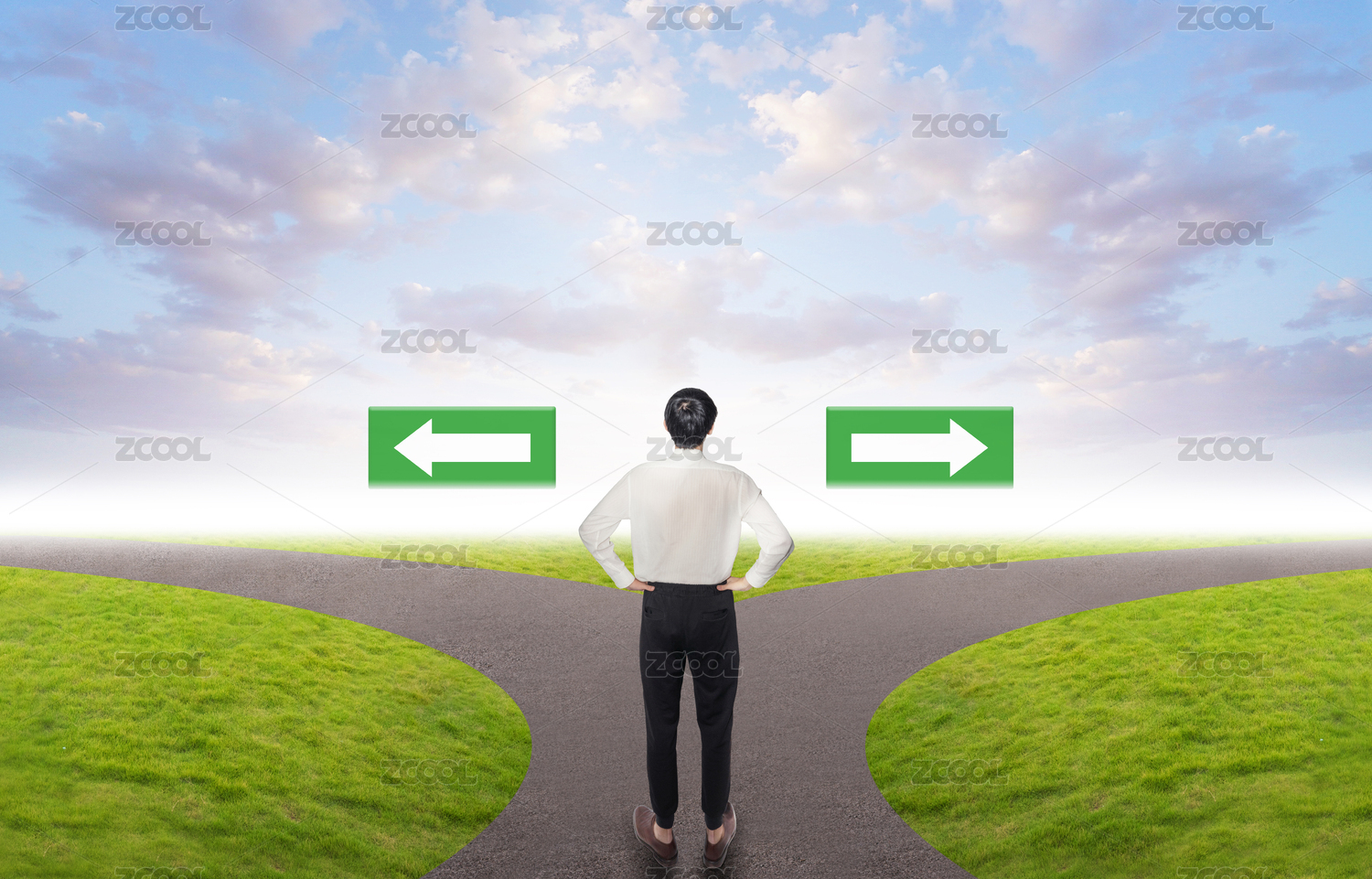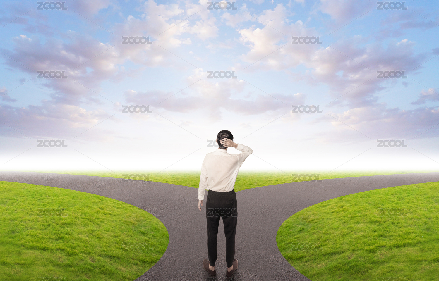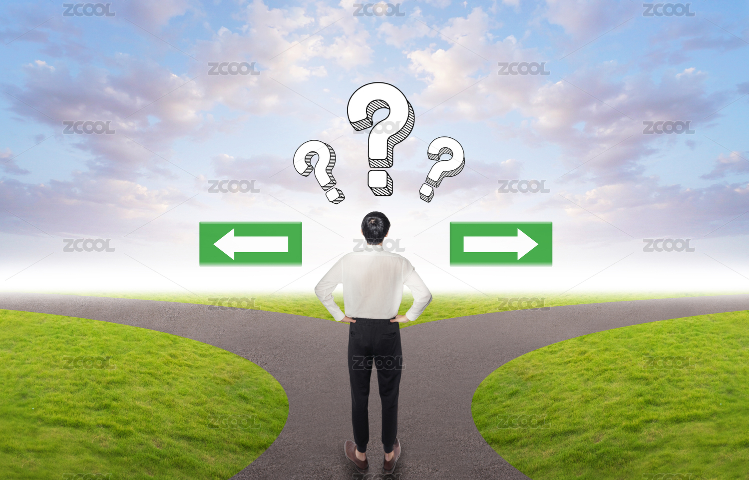 商务人士站在分岔路口不知道如何选择抉择疑问迷路迷失问号概念