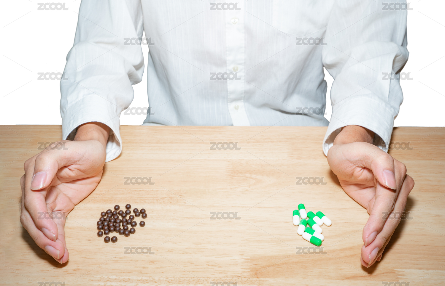 病人手里拿着西药和中药进行选择疑惑不知道选择中医还是西医治疗自己的烦恼压力抑郁焦虑感冒发烧概念