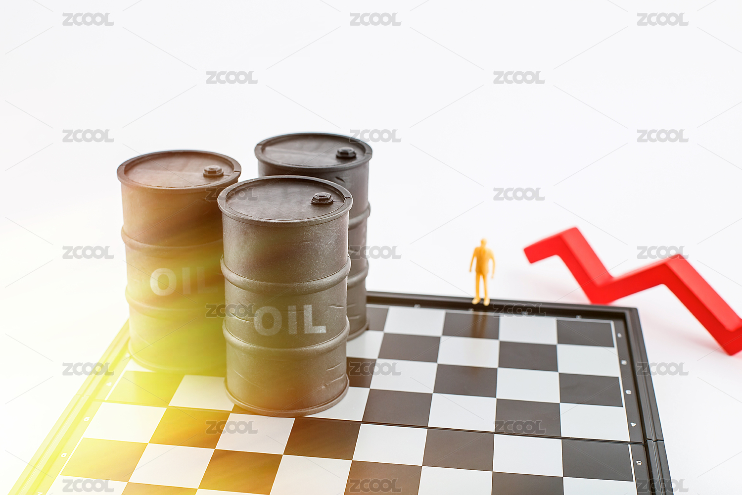 棋盘上的黑色油桶,原油油价主题微距图片。