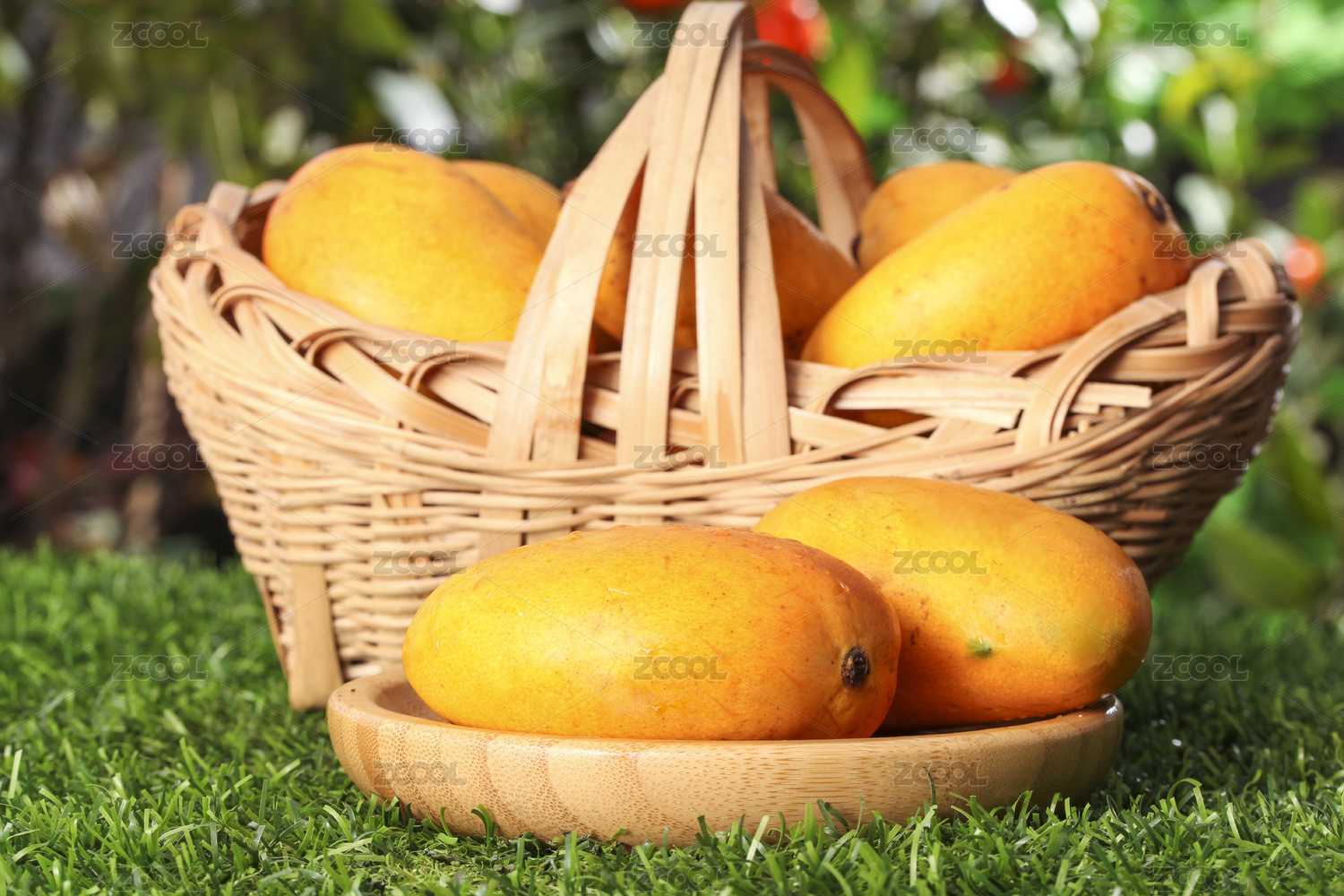 绿色草坪上放着一篓小台农和盘子里的小芒果