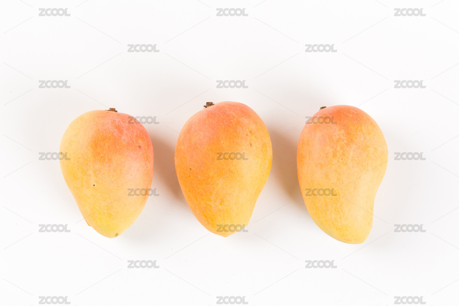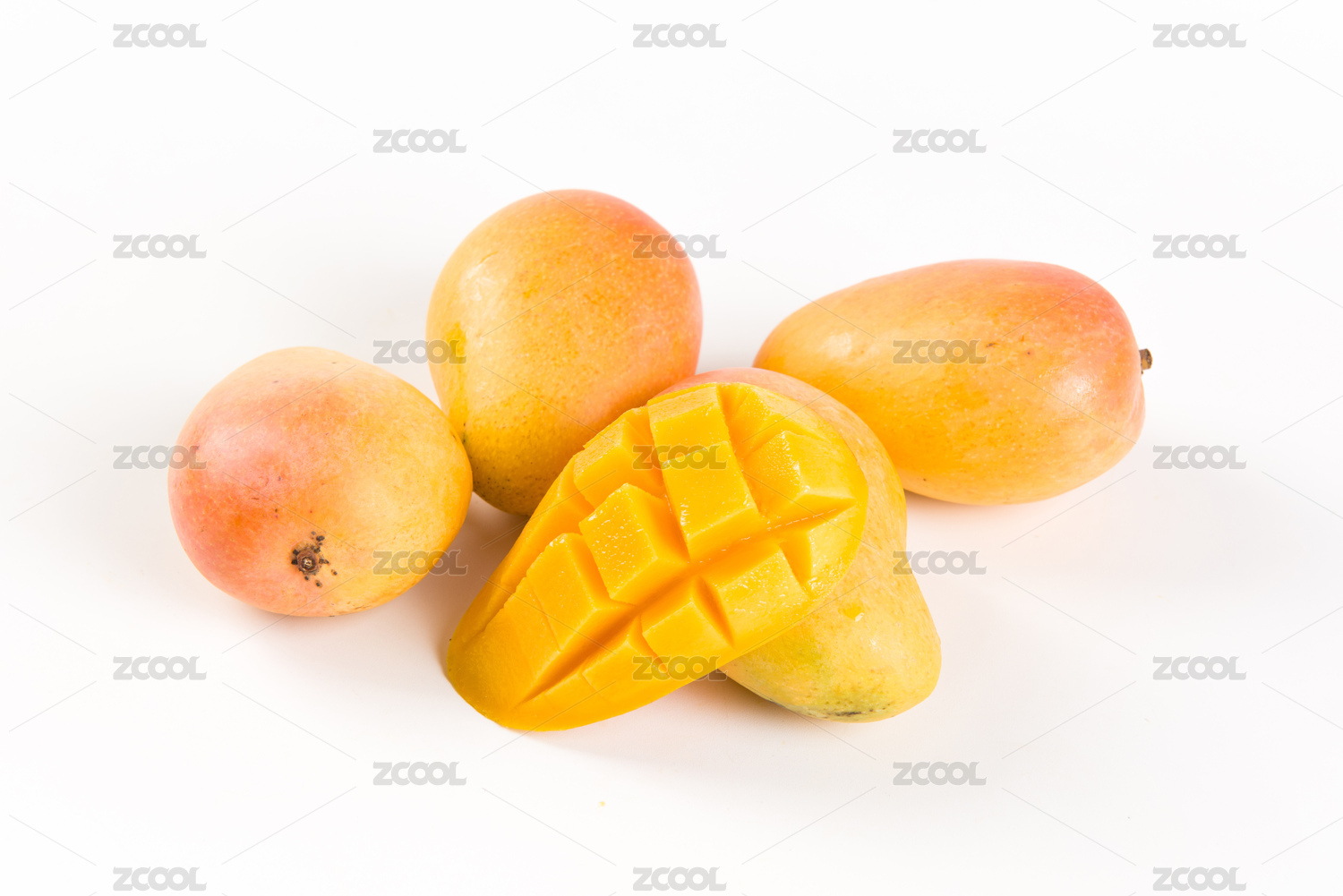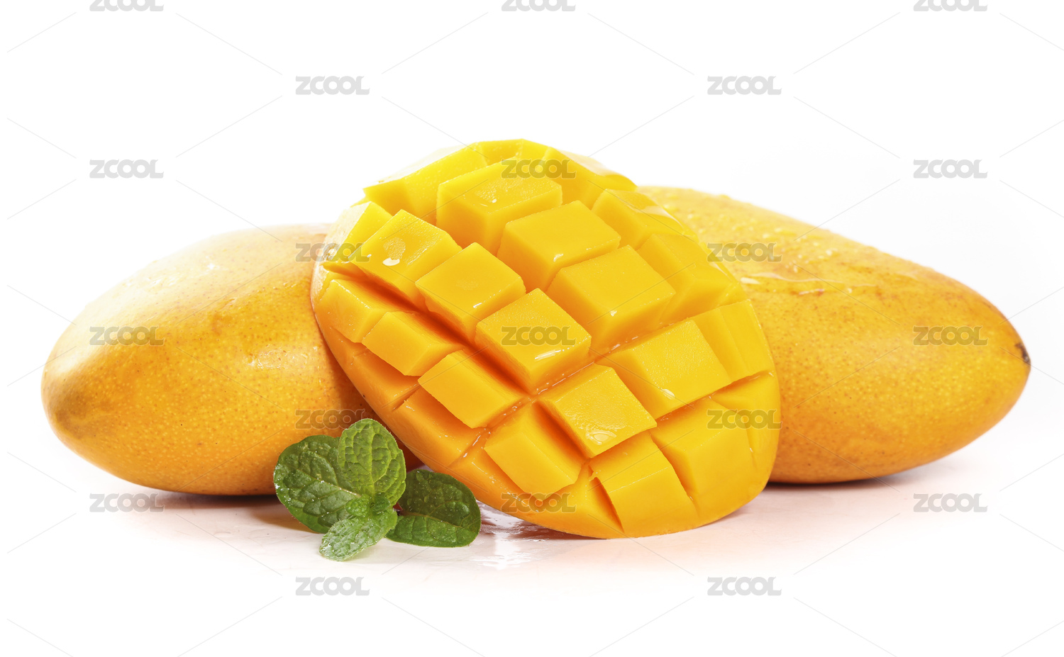 白底上的小台芒果和半边切开的小芒果果肉