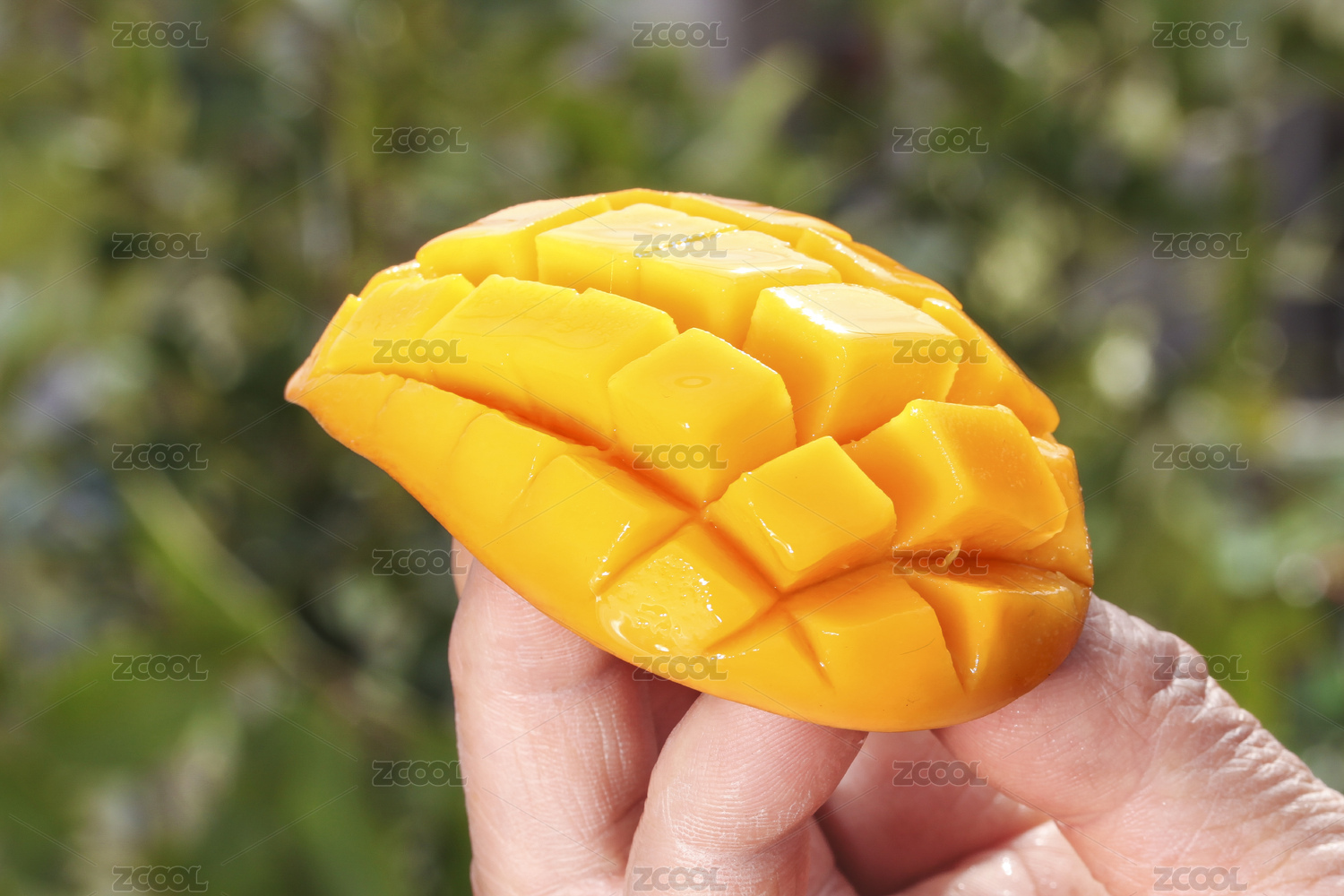 手上拿着半边切开的小芒果果肉